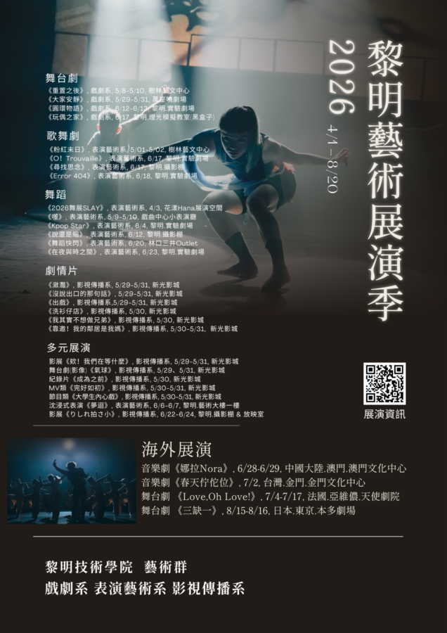 四、演藝影視學群:包含表演藝術系、影視傳播系及戲劇系‧課程設計以「多方位表演藝術」、「影視專業技術」及「劇場藝術專業人才」為教育主軸,在創作方面,將結合公民營的演出計畫及影視相關產業合作,鼓勵學生參與國內、外各種表演、展售、時尚等相關競賽。