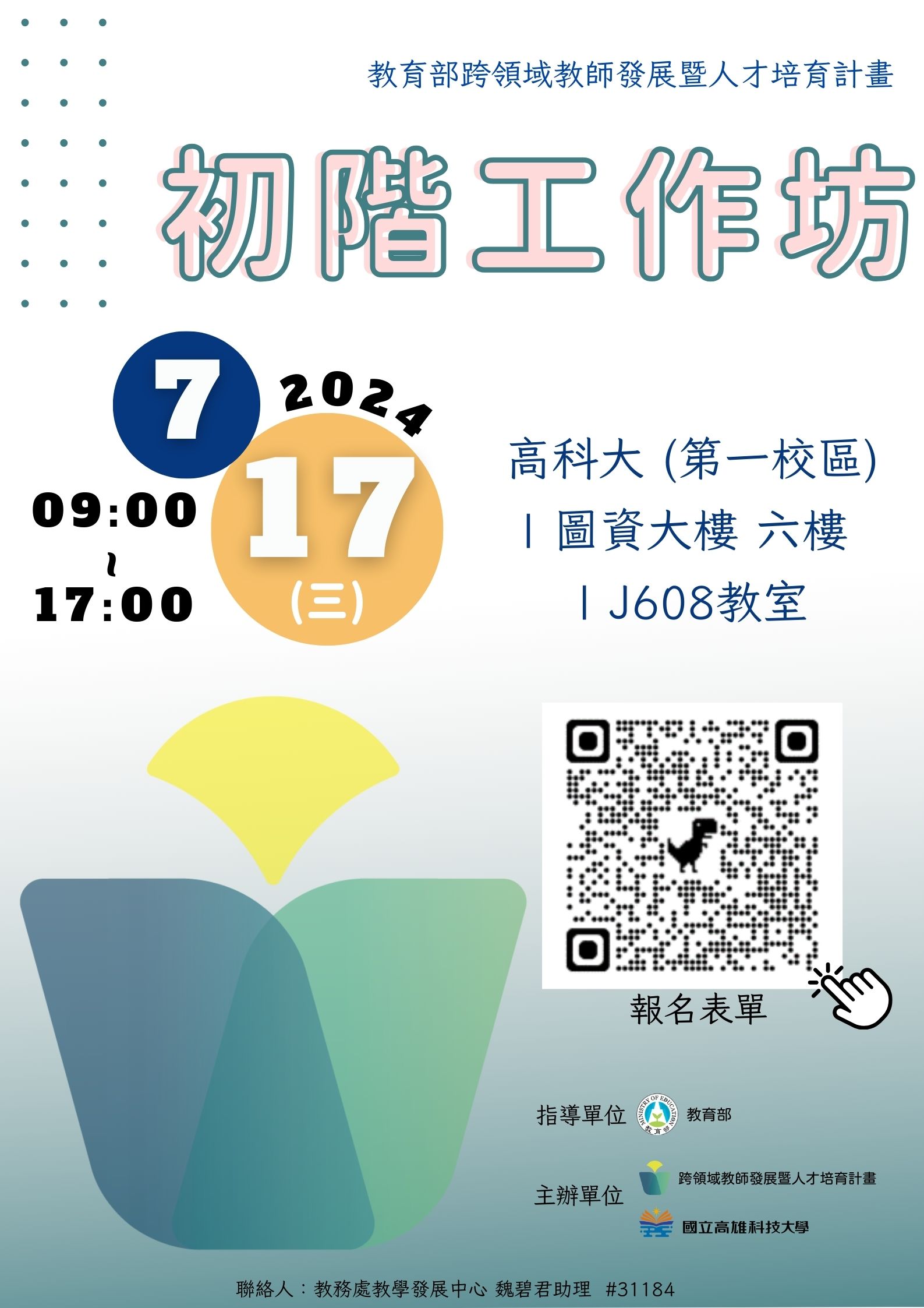 一、 初階工作坊7月份場次活動相關訊息如下: (一) 活動時間:113年7月17日(星期三) 9時至17時,請於當日8時30分至9時前往報到。 (二) 活動地點:國立高雄科技大學(第一校區)圖資大樓6樓J608教室。 二、 相關行前通知會由主辦單位以E-mail通知;活動相關事宜請洽總計畫辦公室助理蘇珮淳:chunsu@caece.net,或電洽(02)3366-6570。