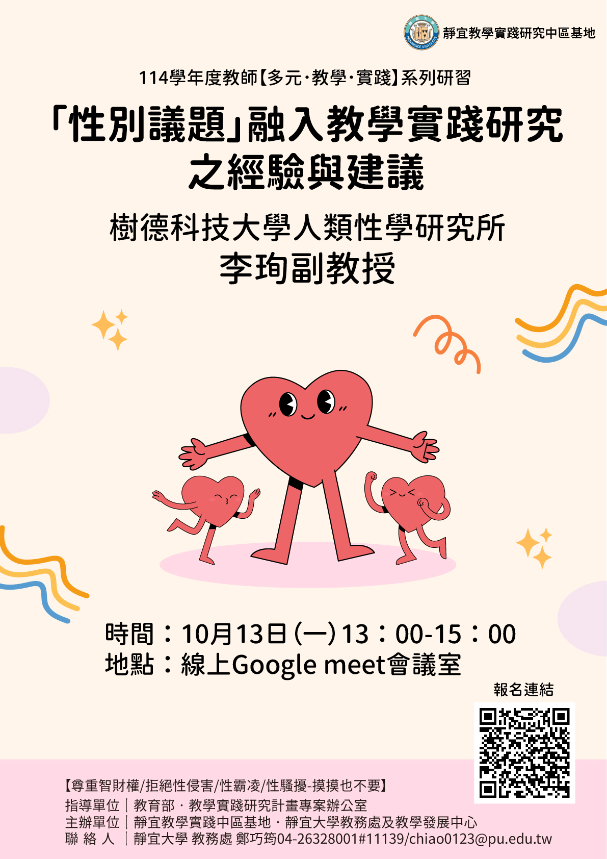 1、 主題:「性別平等教育議題融入教學的理論與實踐」。
