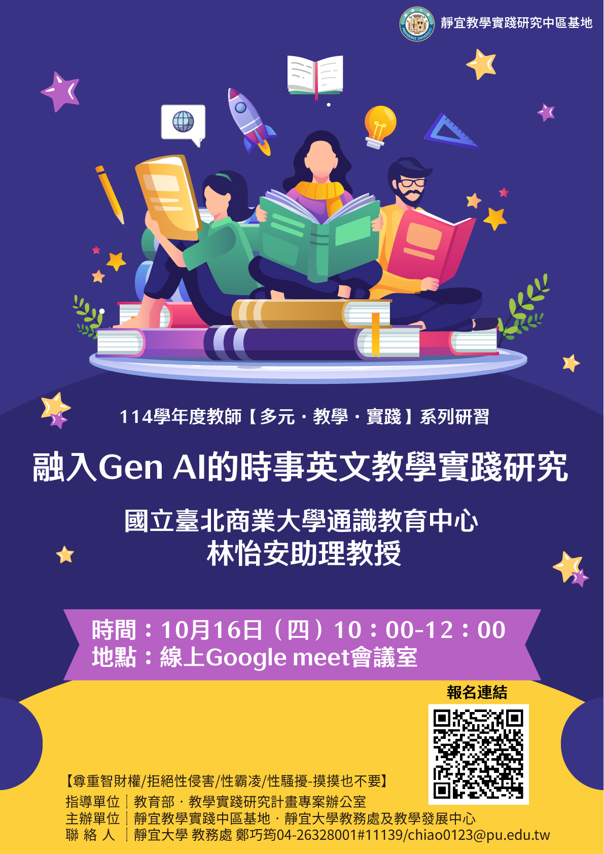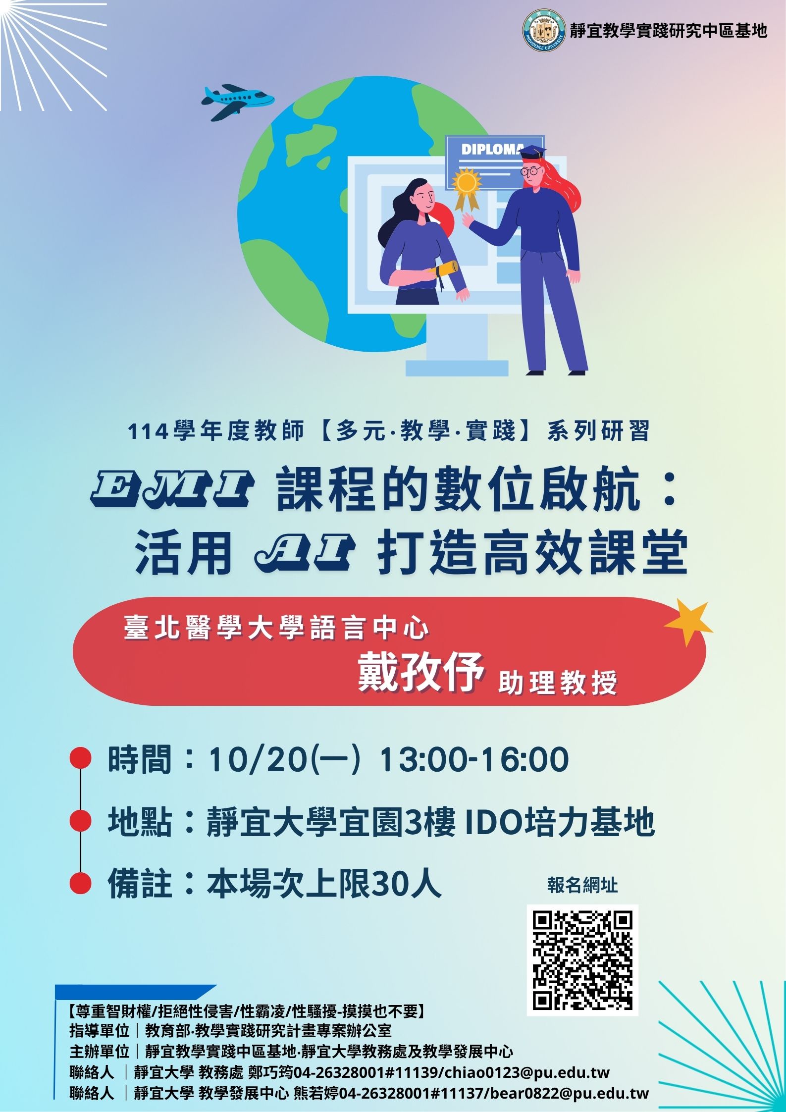 五、 活動聯絡人:靜宜大學教務處鄭巧筠助理(電話:04-26328001分機11139,E-mail: chiao0123 @pu.edu.tw)。