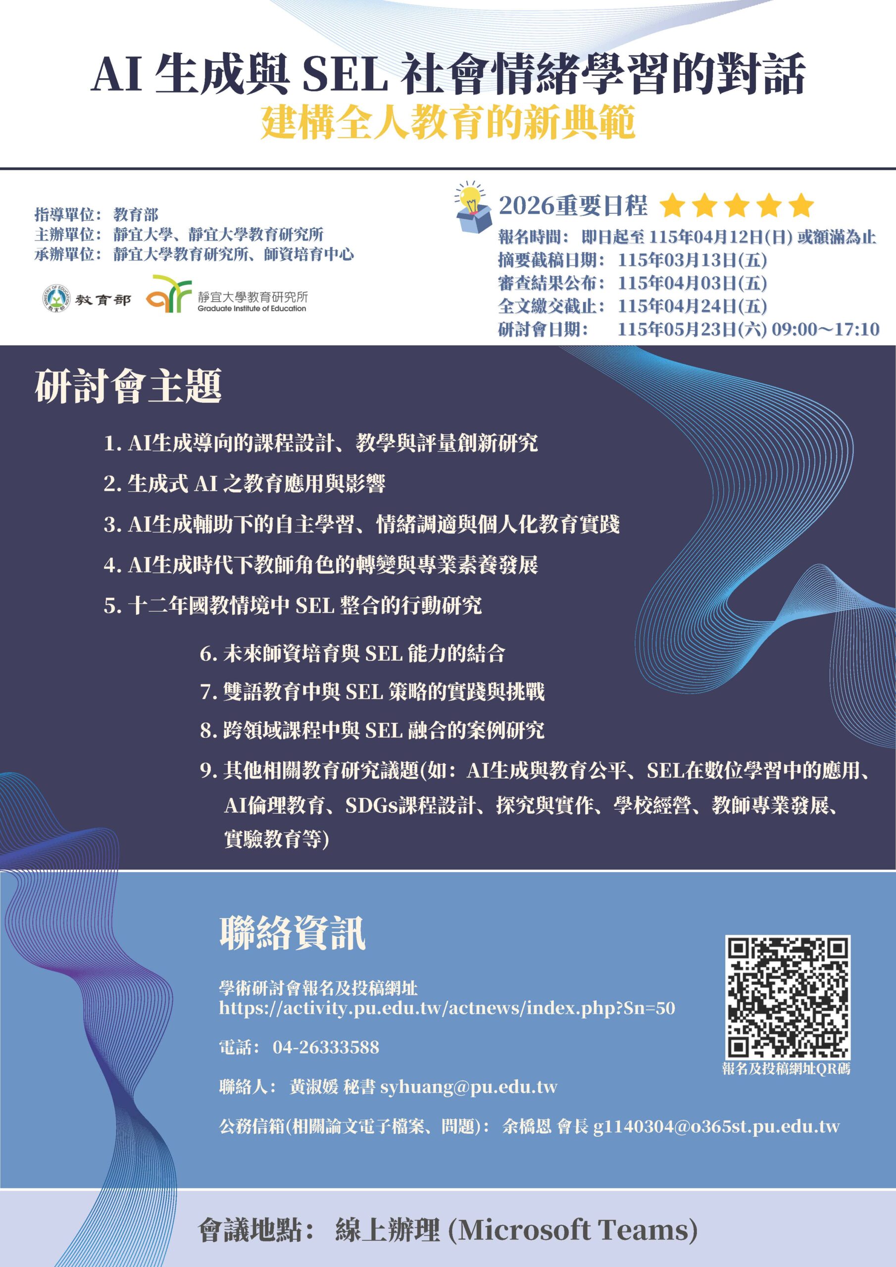 二、 徵稿主題如下:(一)AI生成導向的課程設計、教學與評量創新研究。(二)生成式AI之教育應用與影響。(三)AI生成輔助下的自主學習、情緒調適與個人化教育實踐。(四)AI生成時代下教師角色的轉變與專業素養發展。(五)十二年國教情境中SEL整合的行動研究。(六)未來師資培育與SEL能力的結合。(七)雙語教育中與SEL策略的實踐與挑戰。(八)跨領域課程中與SEL融合的案例研究。(九)其他相關教育研究議題(如:AI生成與教育公平、SEL在數位學習中的應用、AI倫理教育、SDGs課程設計、探究與實作、學校經營、教師專業發展、實驗教育等)。