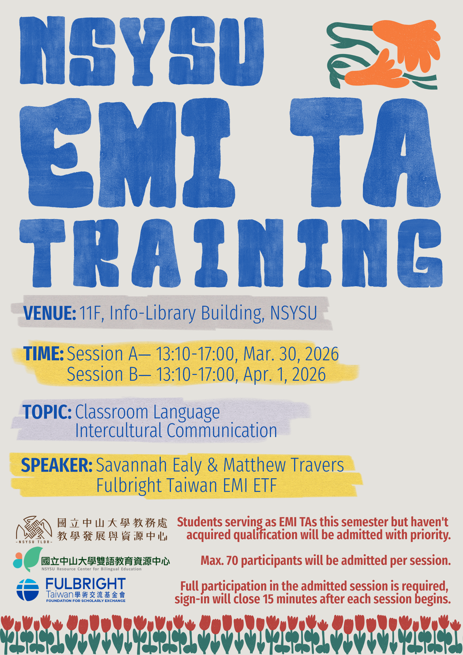 (三) 參與對象:以本學期擔任EMI課程之教學助理且尚未取得EMI TA資格者優先錄取,每梯次最多錄取70名。