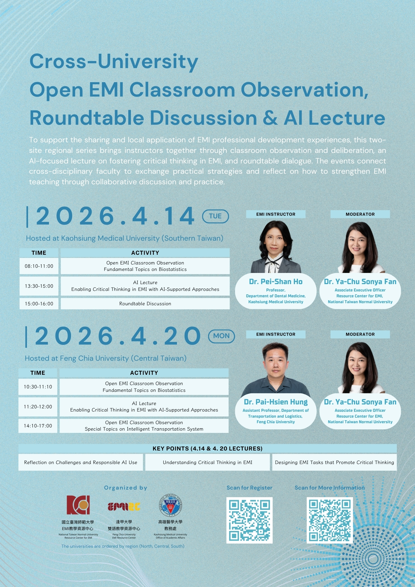 (一) 跨校公開觀議課:邀請本中心曾於 2025 年暑期赴美國德州大學奧斯汀分校,以及於 2026 年赴澳洲新南威爾斯大學參與培訓並返臺之 EMI 教師公開展示課堂,提供 EMI 教師具體之教學示範與實務參考。各場次皆邀請相關專家學者擔任與談人,於課後進行觀議與交流,共同探討 EMI 教學設計、課堂實踐及教學品質精進之可能方向。