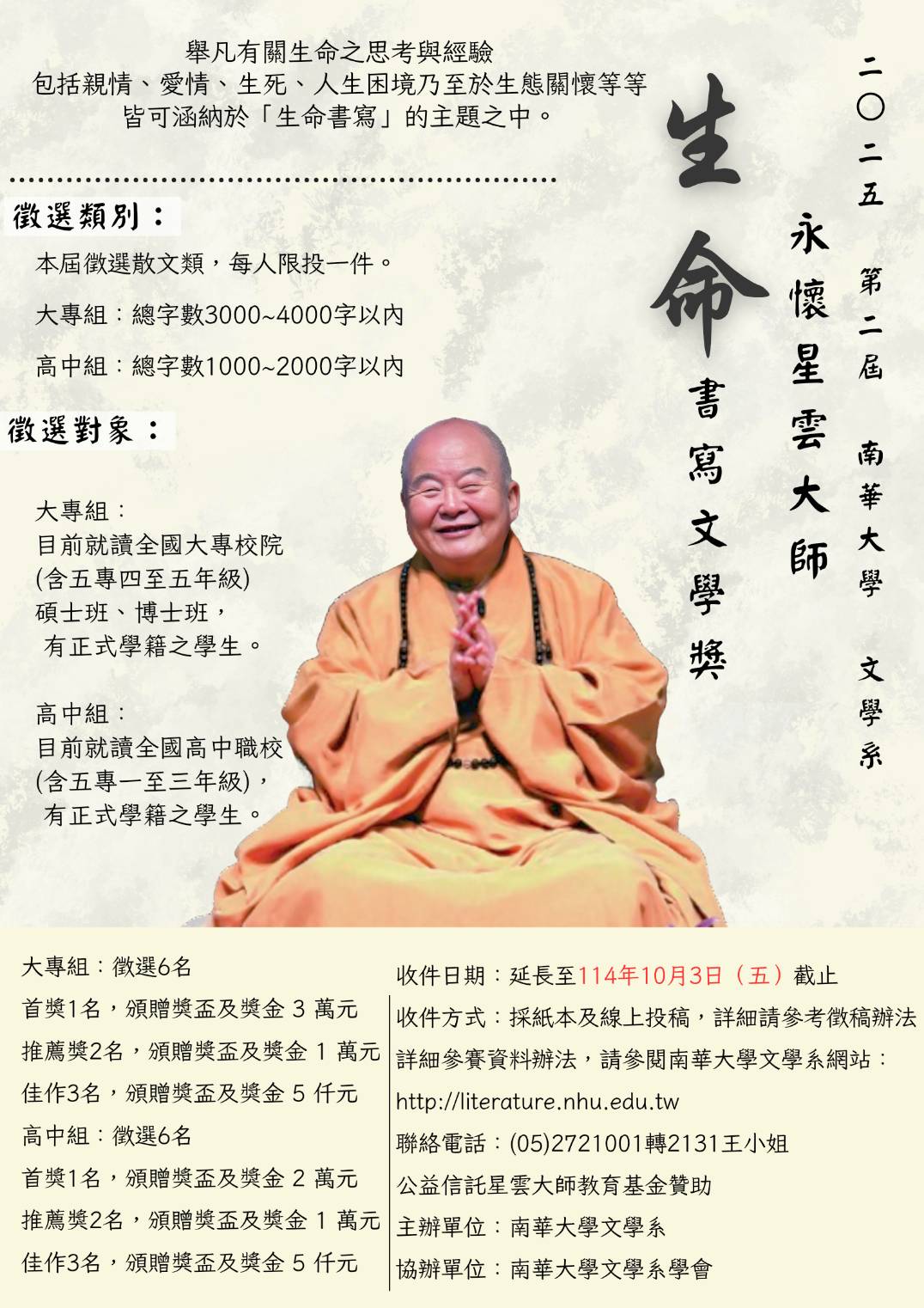 南華大學「2025第二屆永懷星雲大師——生命書寫文學獎」