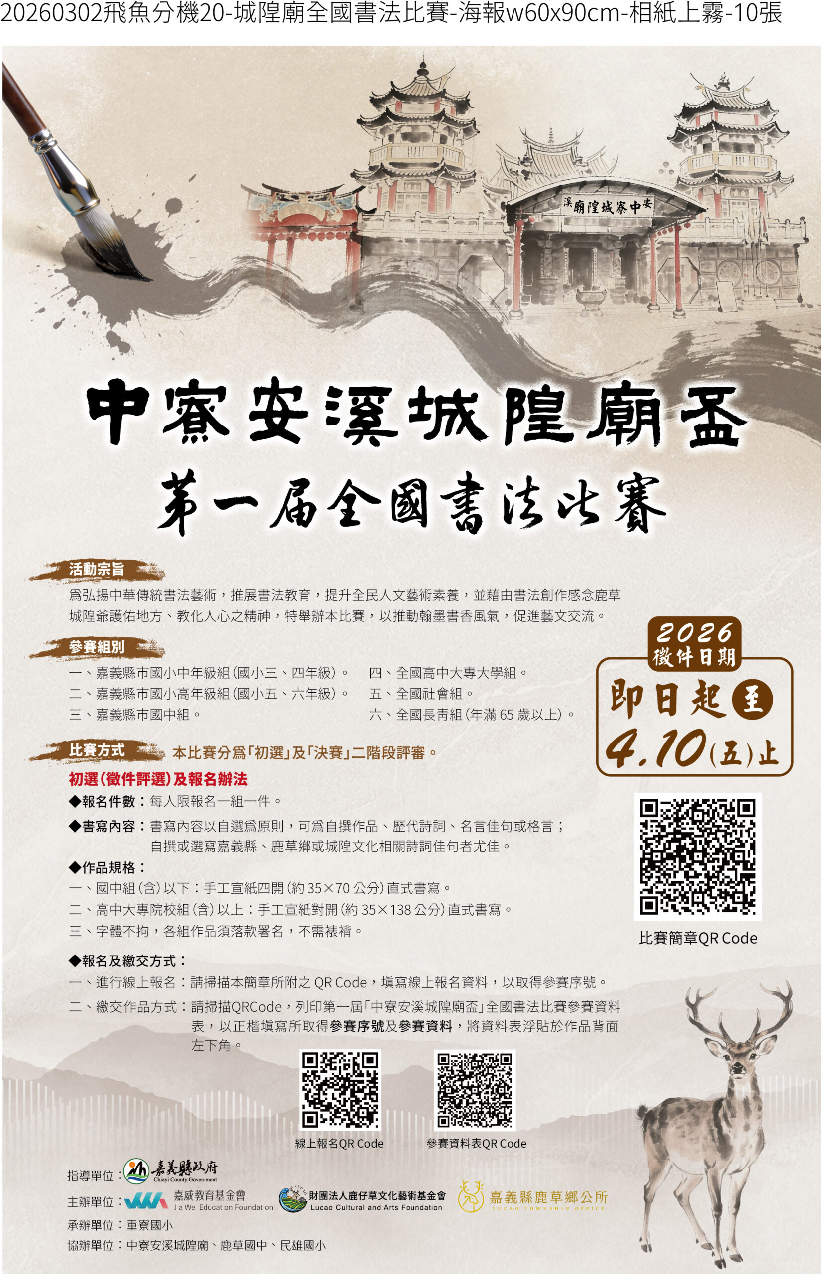 嘉義縣政府辦理「2026第一屆『中寮安溪城隍廟盃』全國書法比賽」