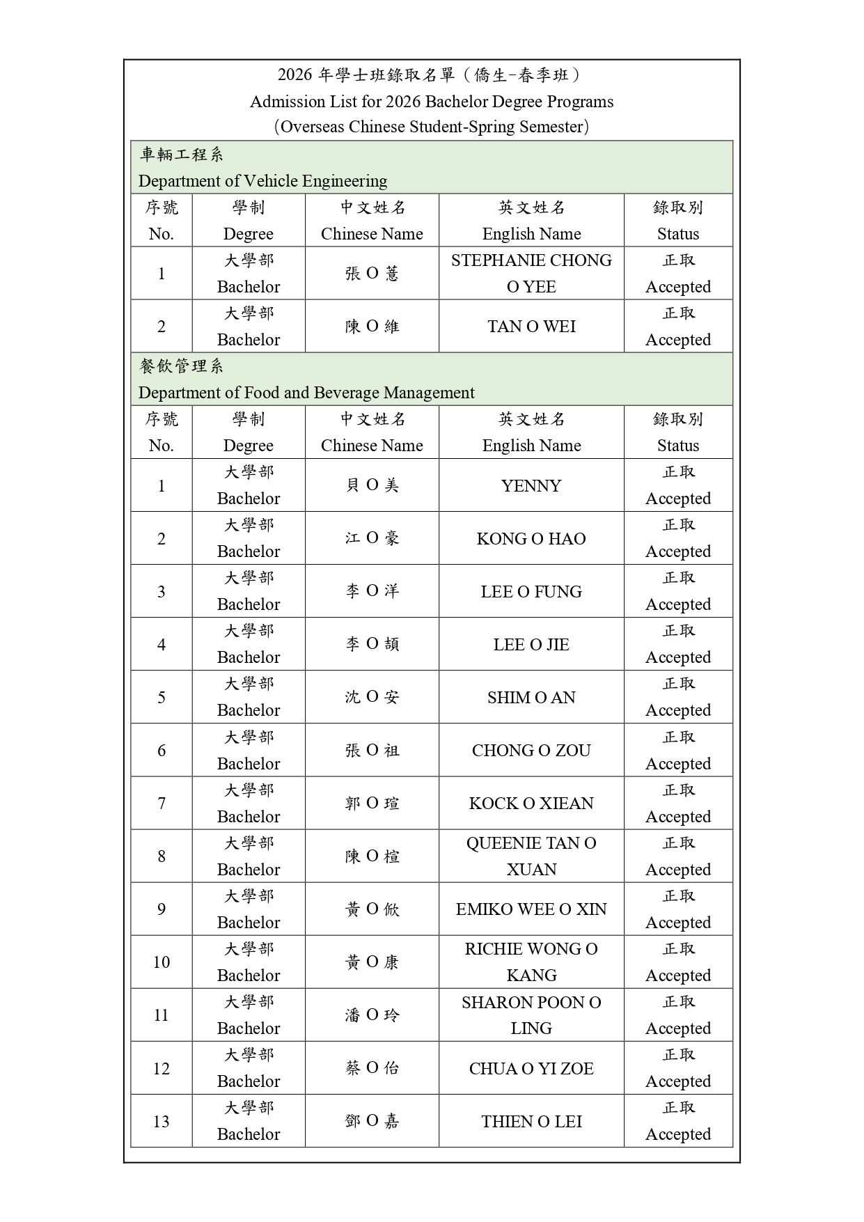 2026年學士班錄取名單 (僑生-春季班) Admission List for 2026 Bachelor Degree Programs ( Overseas Chinese Student-Spring Semester
