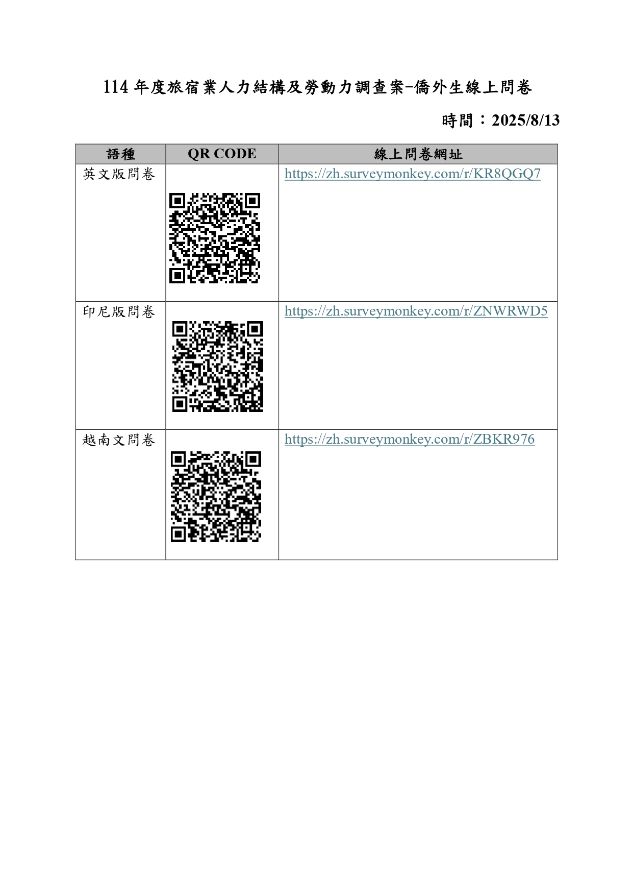 有關交通部觀光署委託思多葛市場研究股份有限公司辦理「114年度旅宿業人力結構及勞動力調查案」之問卷,歡迎各位同學填寫問卷