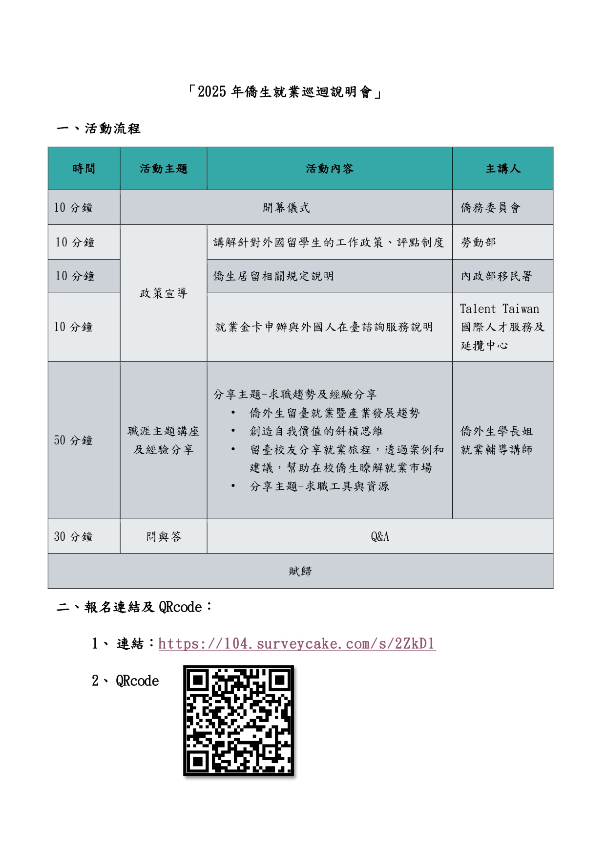 三、檢附活動流程及報名網址QRcode乙份(如附件),報名網址:https://104.surveycake.com/s/2ZkDl,敬請協助廣為周知並鼓勵僑生踴躍報名。
