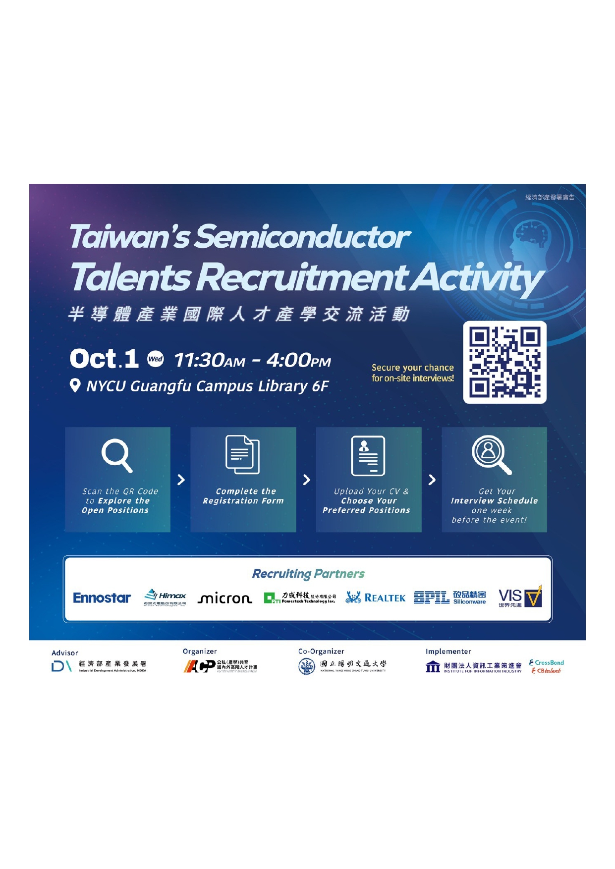 四、 活動網頁活動網頁及報名資訊:https://www.cbtalent.tw/nycu-semi-recruitment/