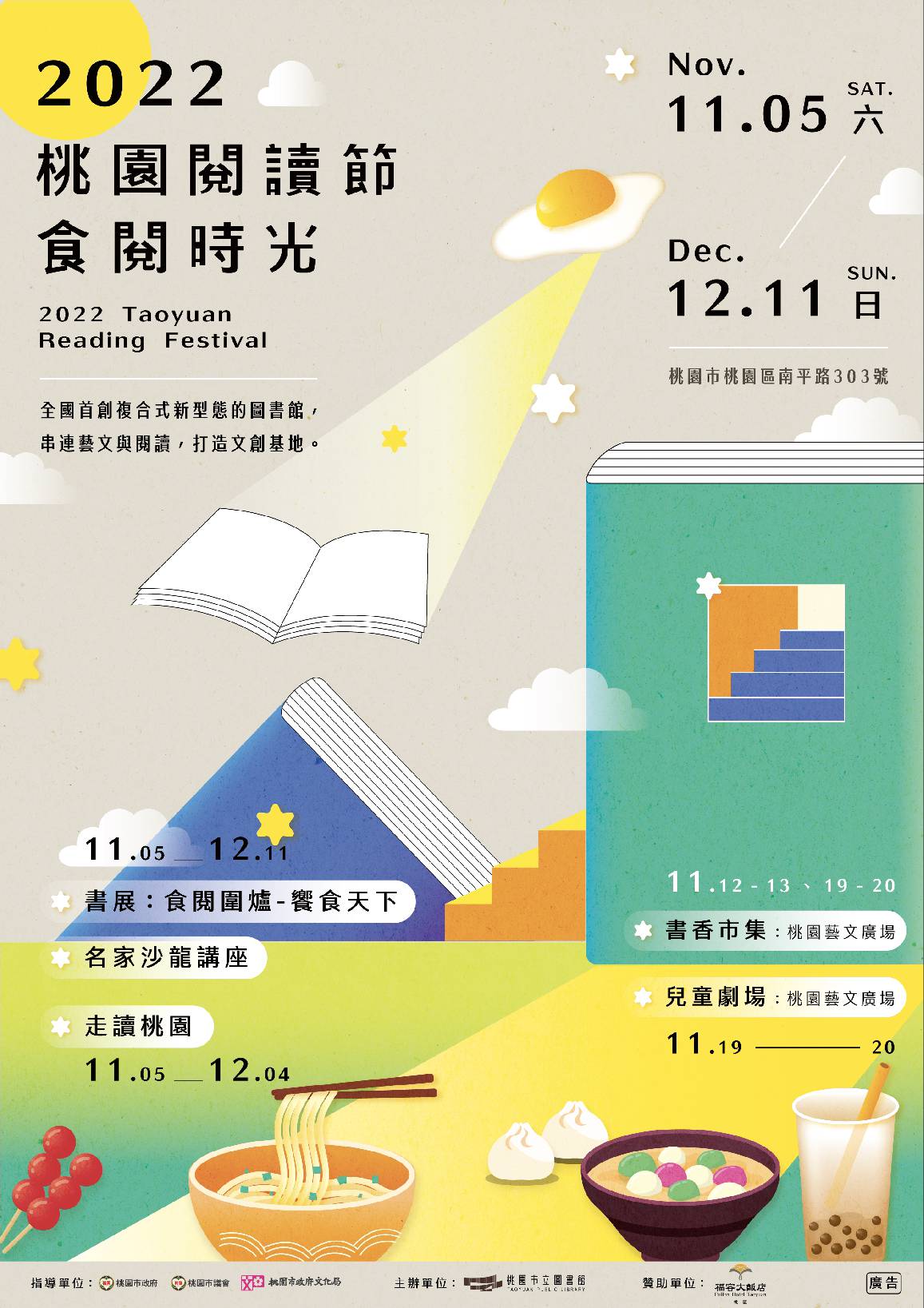 一、 桃園市立圖書館規劃「2022桃園閱讀節『食閱時光』」,期盼藉由全市性的節慶閱讀嘉年華,提升桃園市整體閱讀習慣及風氣,在新總館、各分館、獨立書店或本市藝文場所辦理各項豐富閱讀活動。