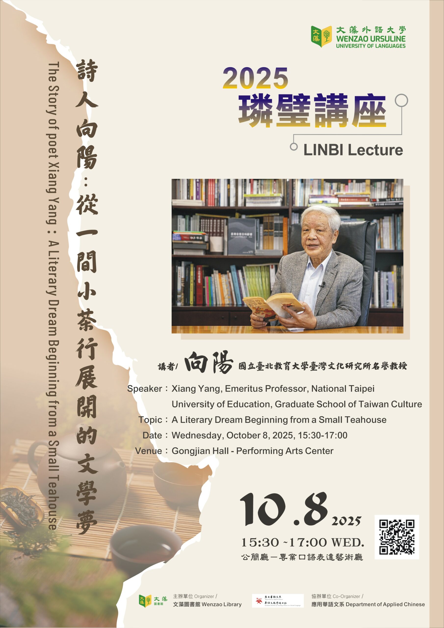 一、 為播撒文學的種子,期盼孕育更多熱愛文學的青年學子,文藻傑出校友陳育虹女士秉持回饋母校之心,特以前校長鮑霦老師之字,設立「璘璧講座」。講座歷年皆邀請文壇名家蒞臨,作為學習典範,引領大家一同走進他們的創作世界。