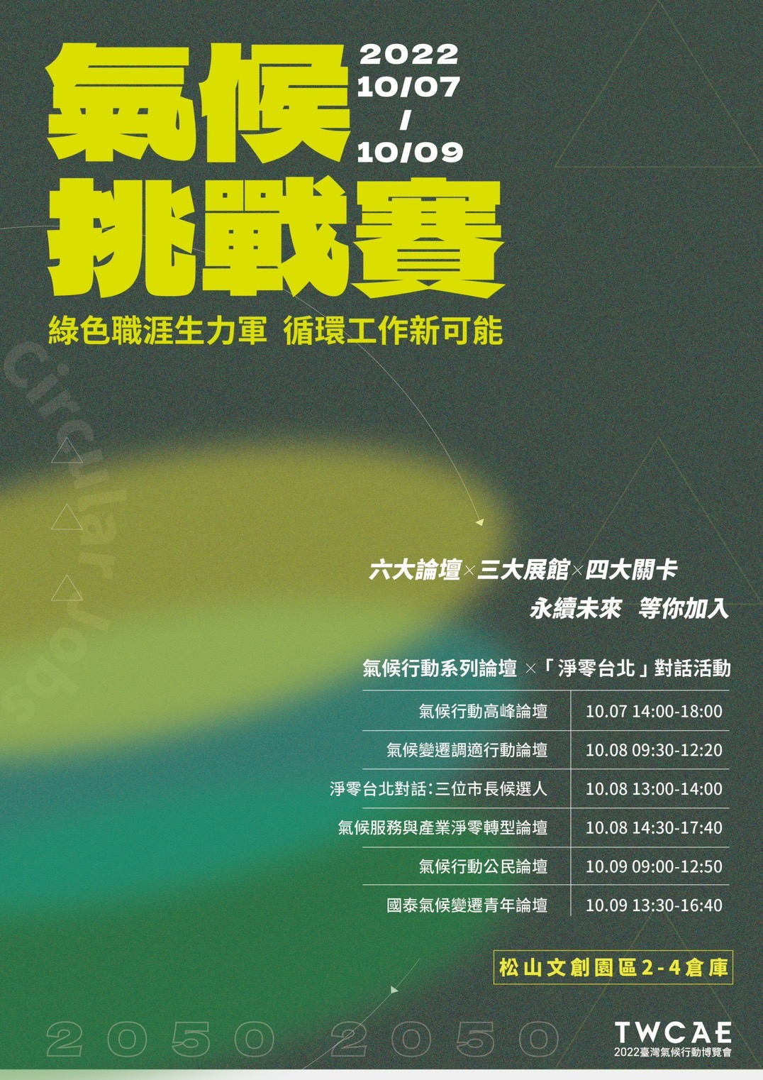 (四)10月7日下午14:00「臺灣氣候行動高峰論壇」報名網址:https://www.accupass.com/event/2209050731131243559446