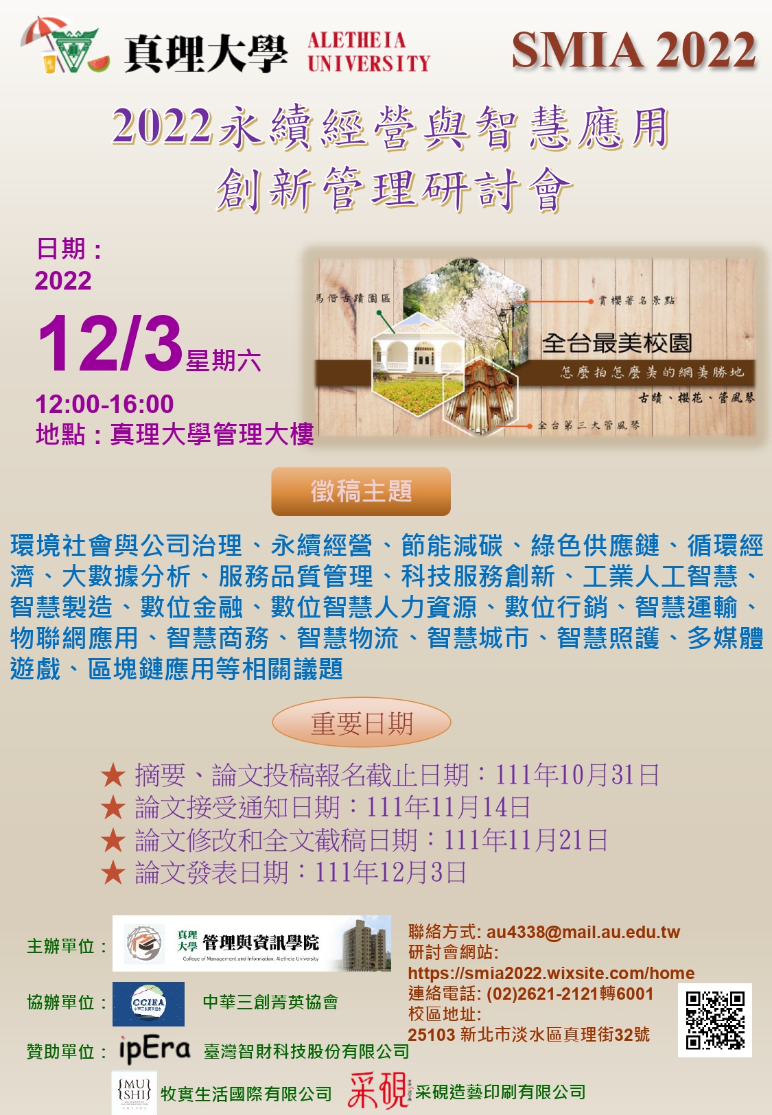 主旨:本校管理與資訊學院舉辦「2022永續經營與智慧應用創新管理研討會」,敬請廣為周知並惠賜稿件,請查照。
