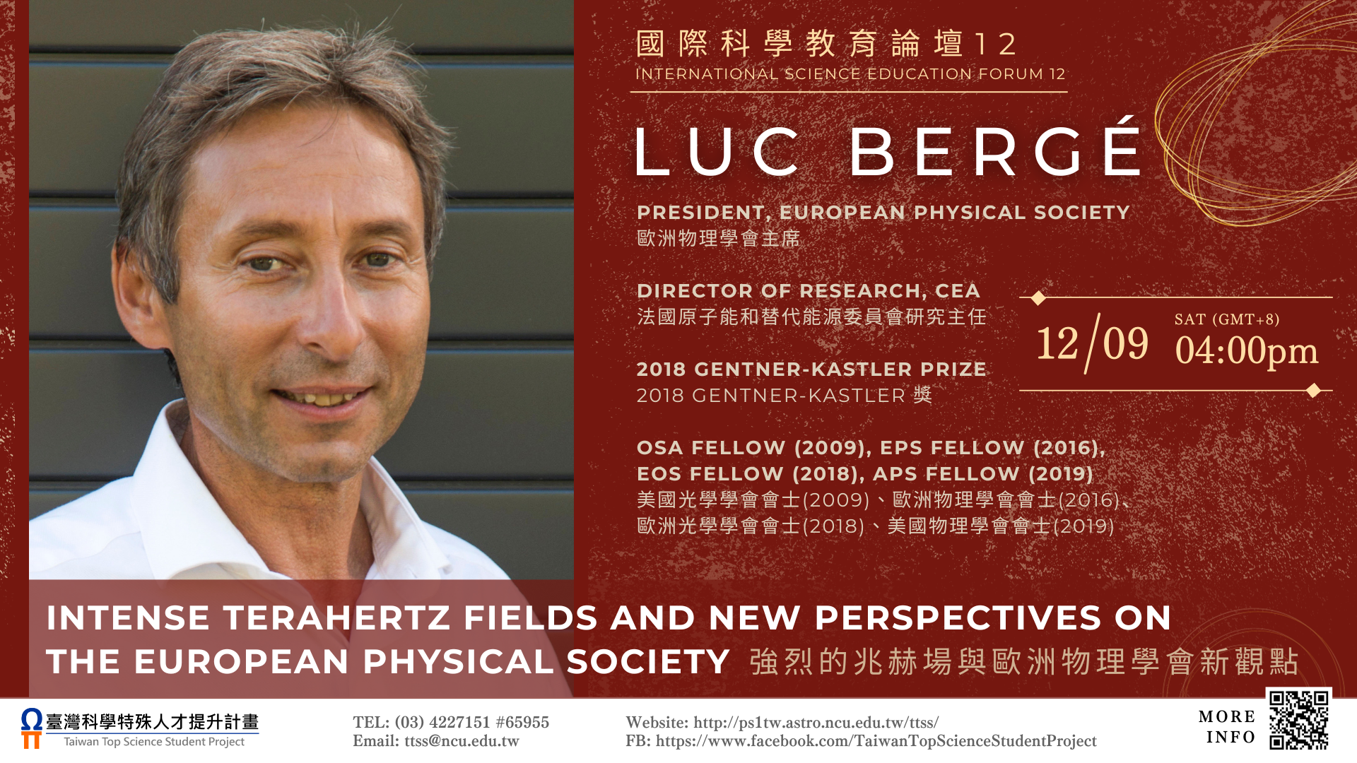 一、Dr. Luc Bergé 是一名法國原子能和替代能源委員會的理論物理學家。他的成就明確地顯示,他是非線性波傳播、飛秒雷射絲化、太赫茲脈衝生成及相關應用領域的世界級先鋒和領導者。他同時是歐洲物理學會主席、法國原子能和替代能源委員會研究主任,這次他以「Intense terahertz fields and new perspectives on the European Physical Society」主講,內容將涵蓋兆赫場研究及歐洲物理學會對歐洲物理教育的一些新觀點。