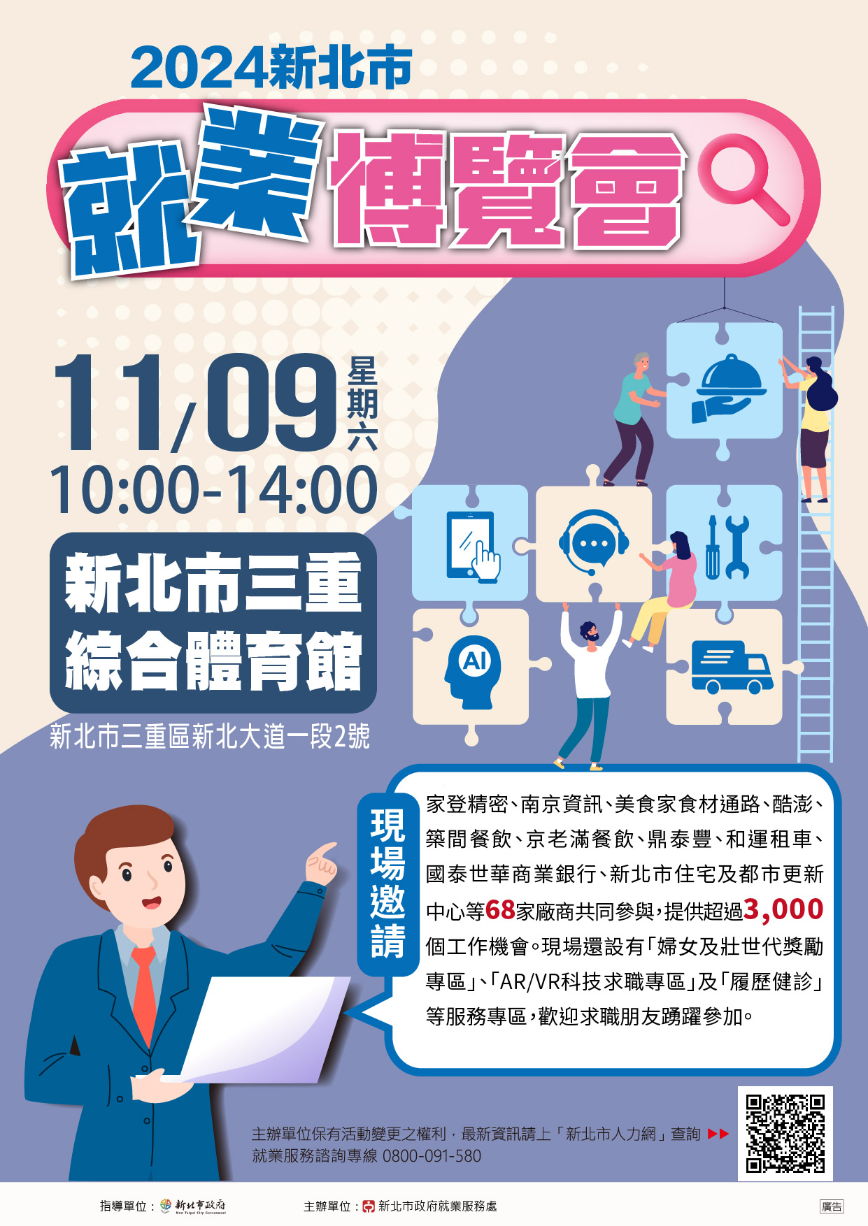 新北市就業服務處於11月9日(六)上午10點至下午2點在新北市三重綜合體育館(三重區新北大道一段2號),邀請68家廠商舉辦就業博覽會,歡迎求職朋友踴躍參加。