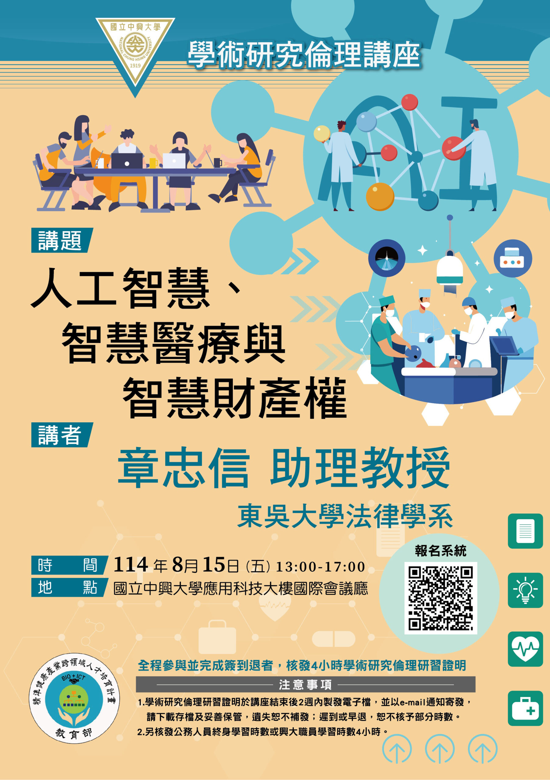 本校謹訂於本(114)年8月15日(五)舉辦「學術研究倫理講座」,敬請惠予公告並轉知所屬教職員生踴躍報名參加,請查照。