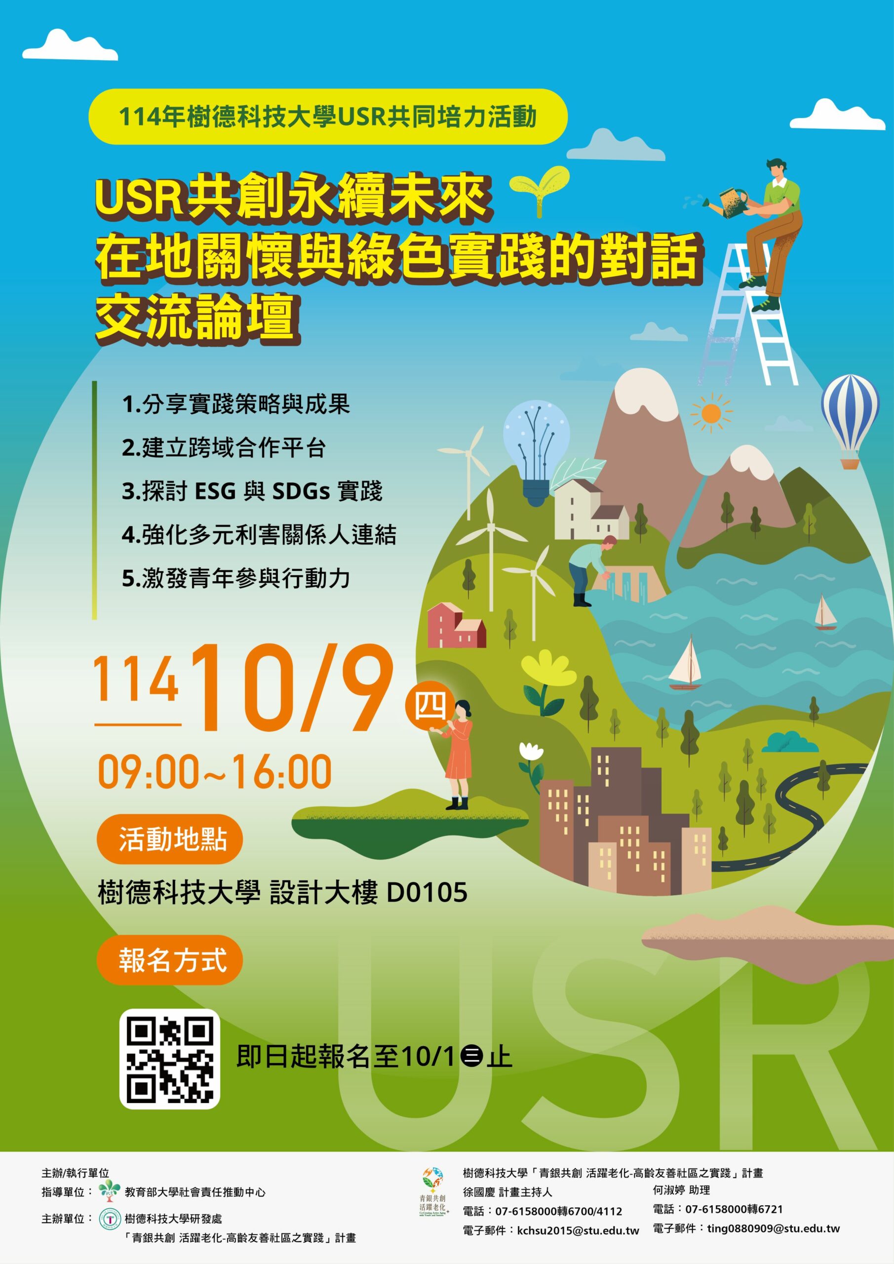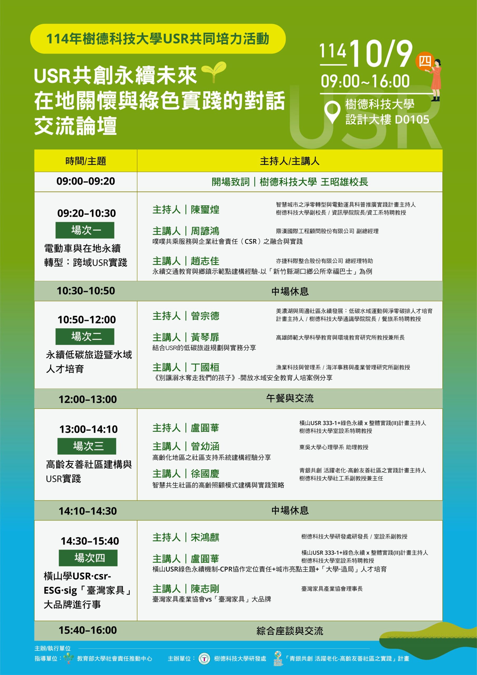 一、面對全球化挑戰與在地議題,大學為知識與實踐場域角色更顯重要。旨揭活動係匯聚本校USR計畫團隊智慧,聚焦高齡友善、電動車永續、水環境保育與文化永續等議題,透過經驗分享與跨域對話,共同推動大學社會責任,促進在地與永續發展。論壇主題場次如下: