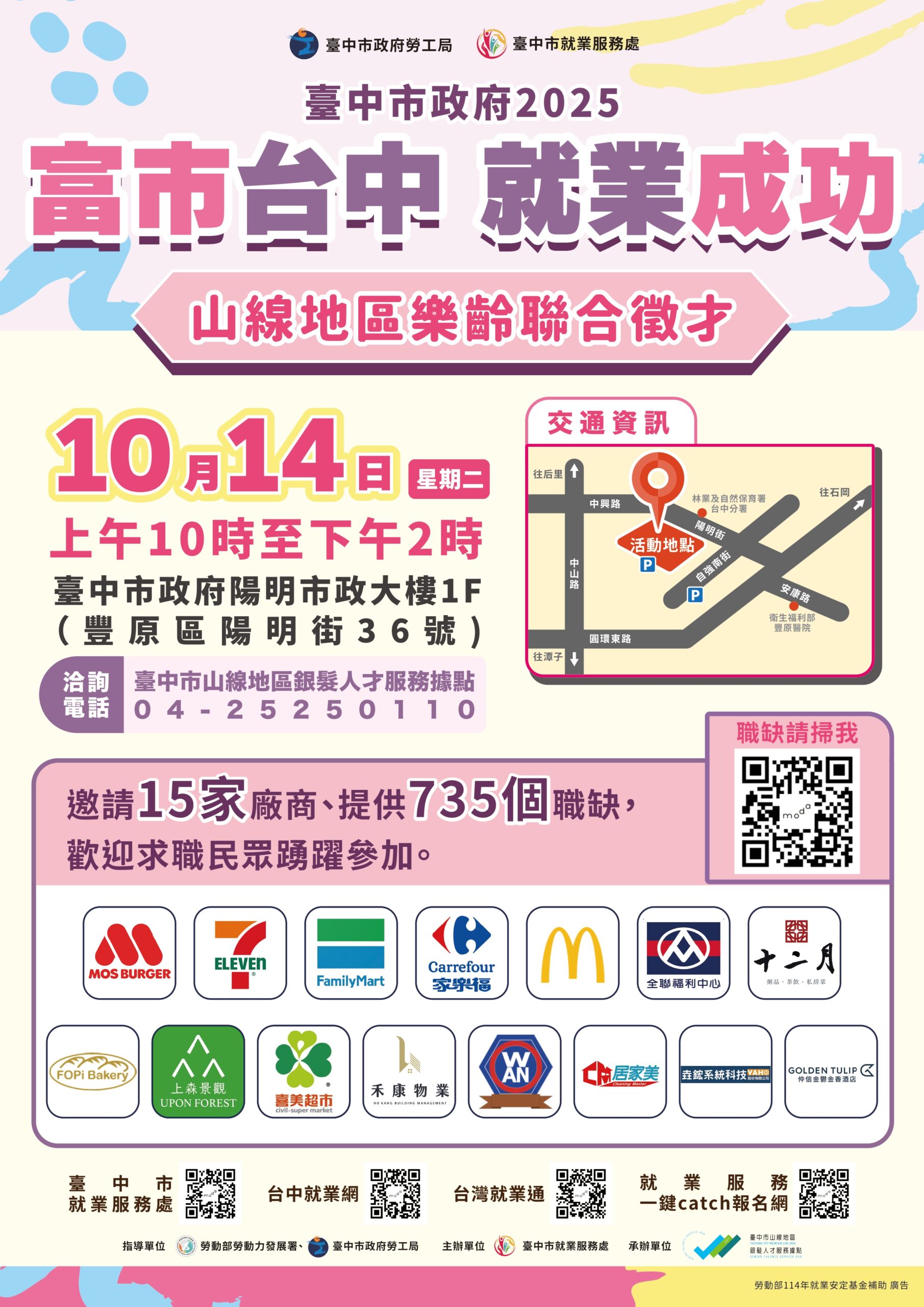 「臺中市政府10月14日(二)於陽明市政大樓舉辦山線地區樂齡聯合徵才,邀請15家廠商,提供超過700個職缺,詳情至臺中市就業服務處官網查詢。」。
