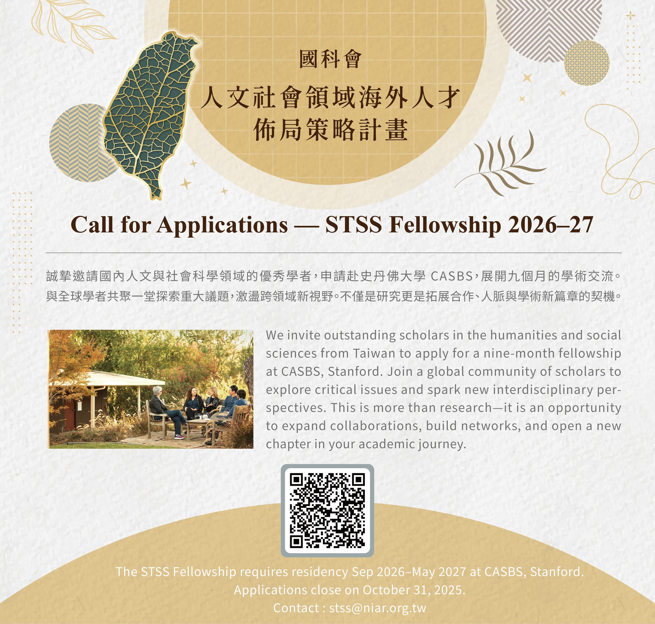 國科會「人文社會領域海外人才佈局策略計畫」於115年度徵求一名具備人文社會領域背景之學者赴美國史丹佛CASBS研究交流,自即日起接受申請至114年10月31日中午前截止,請查照轉知。