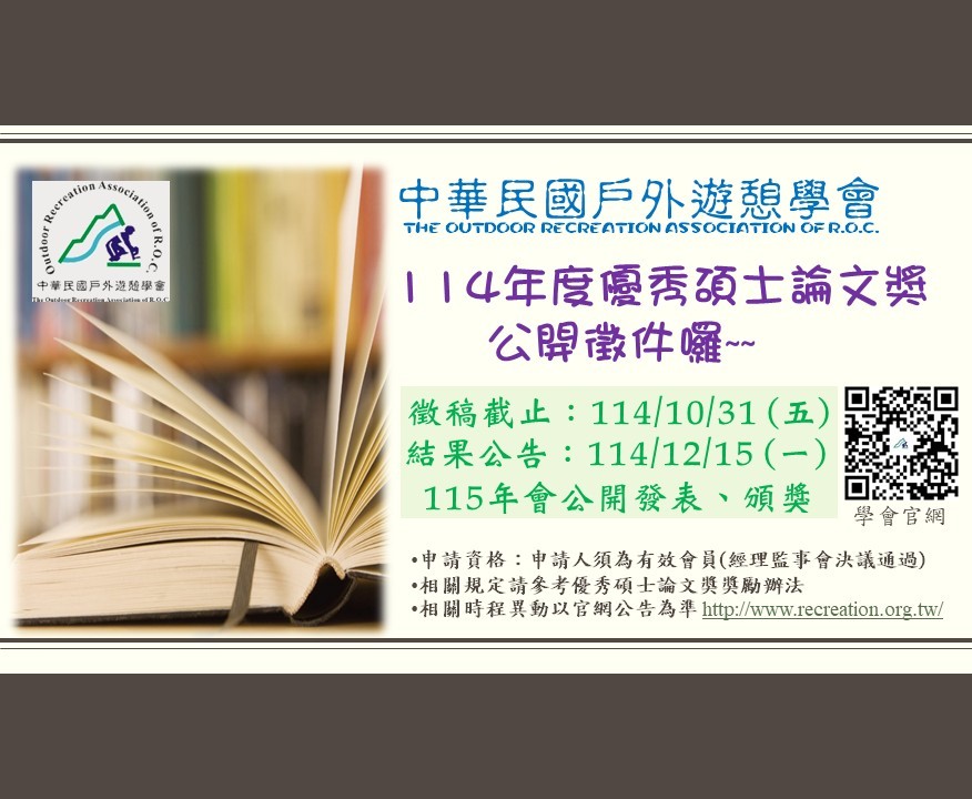 一、旨揭徵件活動為支持休閒遊憩相關領域研究發展,鼓勵本會會員之應屆碩士畢業生其碩士論文水準優異者繼續從事進階研究,特訂定獎勵辦法並於每年會員大會發表及頒獎,歡迎踴躍報名參加。