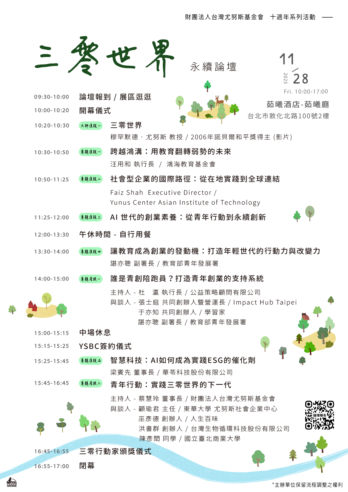 一、台灣尤努斯基金會係經2006年諾貝爾和平獎得主暨現任孟加拉臨時政府首席顧問穆罕默德.尤努斯(Prof. Muhammad Yunus)教授授權,於2014年正式設立。基金會致力於推動格萊珉模式,透過教育扶助經濟弱勢族群創辦微型企業,以實現經濟自立;同時積極倡議社會型企業理念,推動「三零永續目標」—零淨碳排放、零貧窮與零失業。基金會亦與多所大專院校合作設立「尤努斯社會企業中心」,期望藉由永續倡議與青年教育擴大社會影響力,攜手台灣邁向與國際接軌的永續未來。