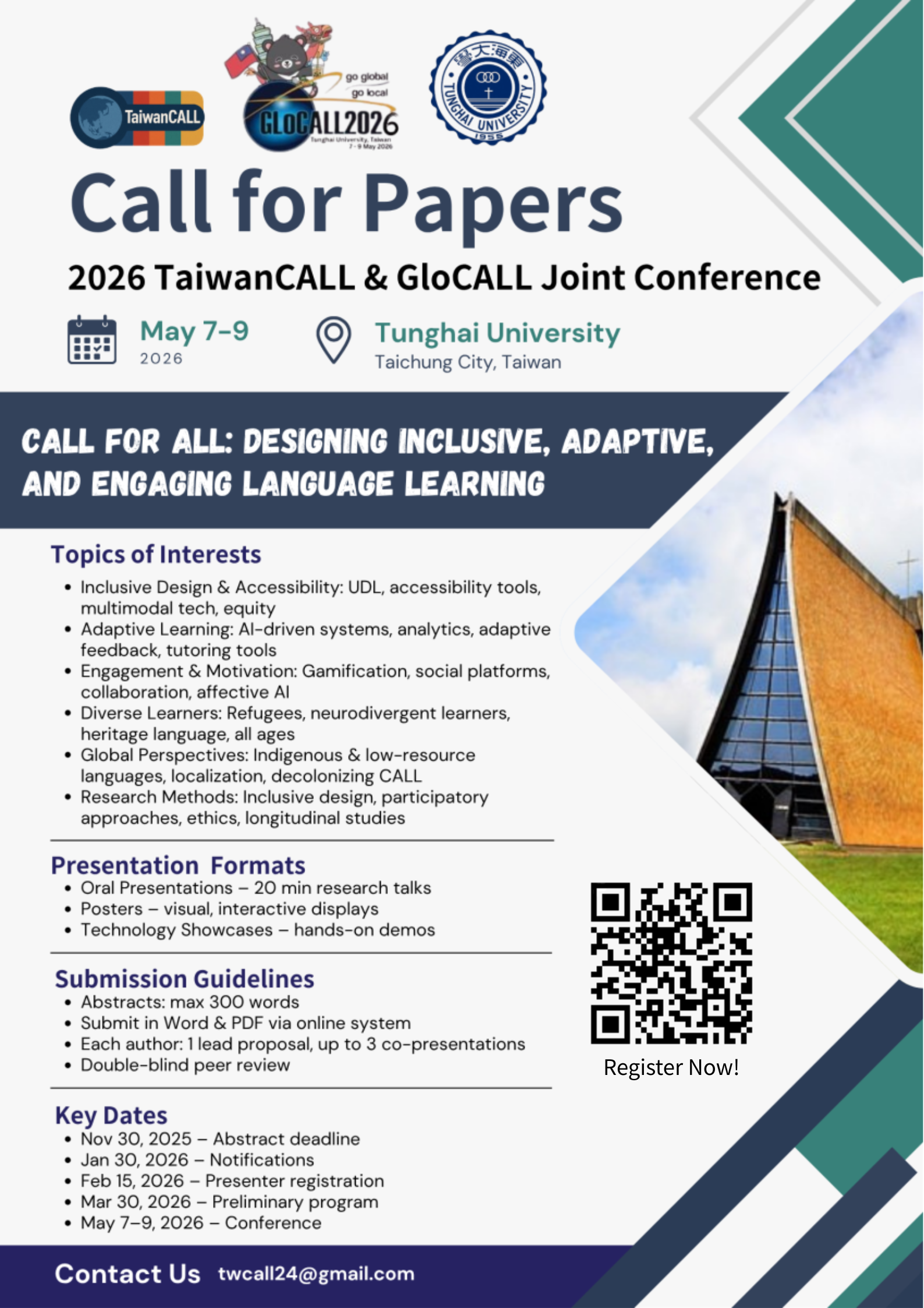 檢送本校外國語文學系辦理「2026臺灣電腦輔助語言學習學會暨全球電腦輔助語言學習國際研討會」徵稿啟事,敬請貴校惠予協助公告並轉知所屬師生踴躍賜稿為荷。