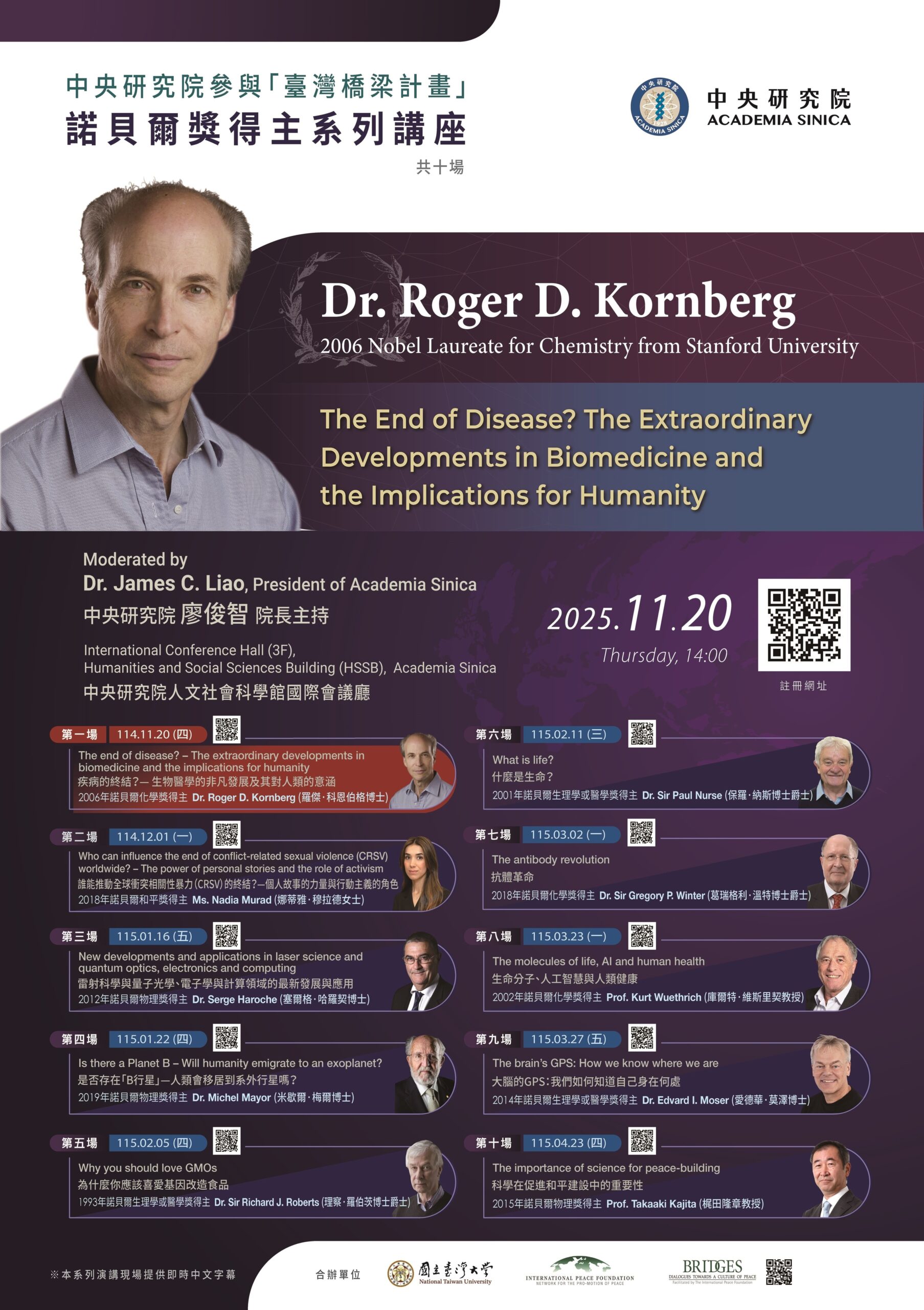 本院參與「臺灣橋梁計畫」(TAIWAN BRIDGES)邀請諾貝爾獎得主羅傑.科恩伯格(Roger Kornberg)博士蒞院發表專題演講,請惠予公告週知。