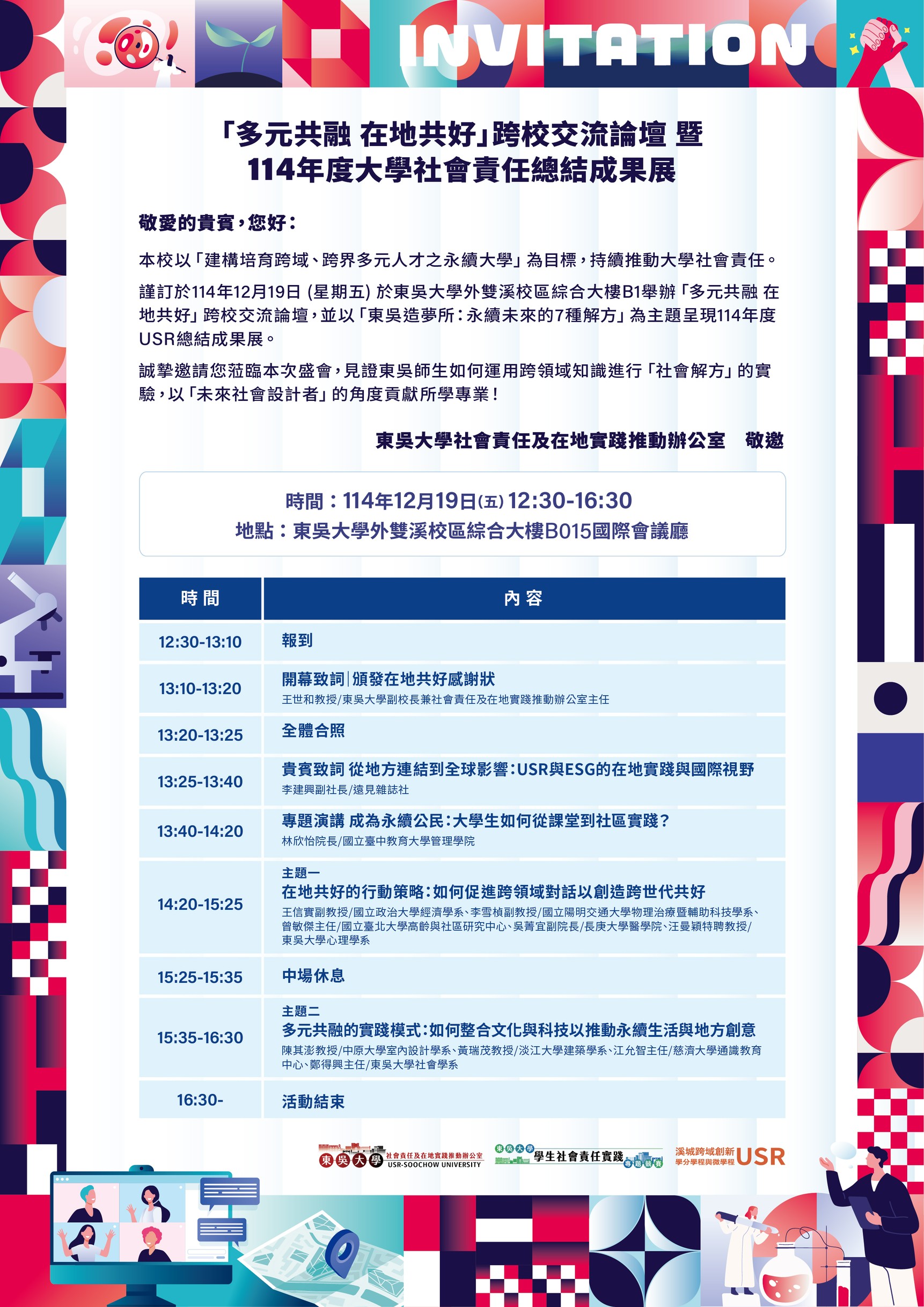 主旨:本校訂於114年12月19日(星期五)舉辦「多元共融 在地共好」跨校交流論壇暨大學社會責任總結成果展,敬邀貴校師長及同仁踴躍參加,並請惠允公(差)假出席,請查照。