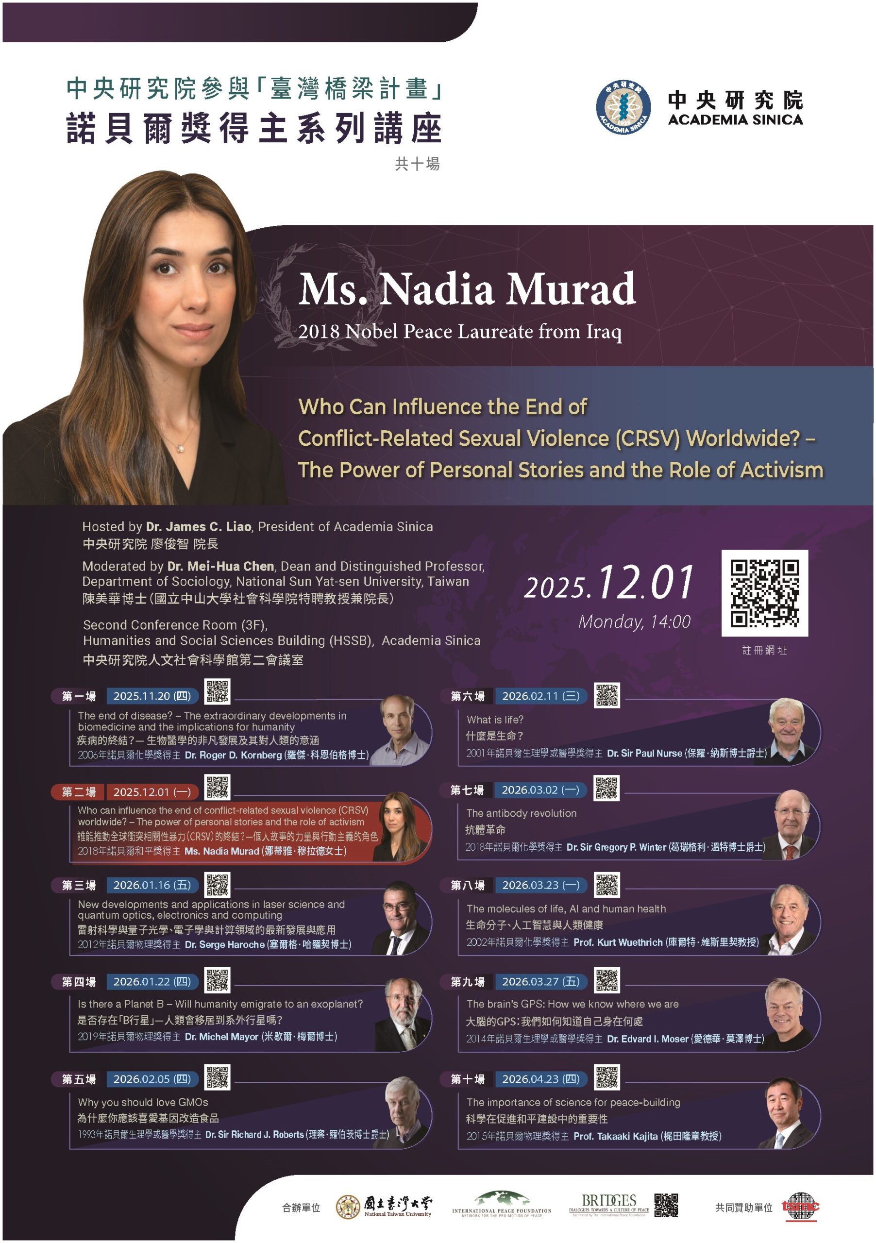 一、「臺灣橋梁計畫」自本(114)年11月起至115年4月,共將邀請 31 位諾貝爾獎得主訪問本院及全臺十餘所大學,相關資訊請參閱網站:https://www.peace-bridges.net/。