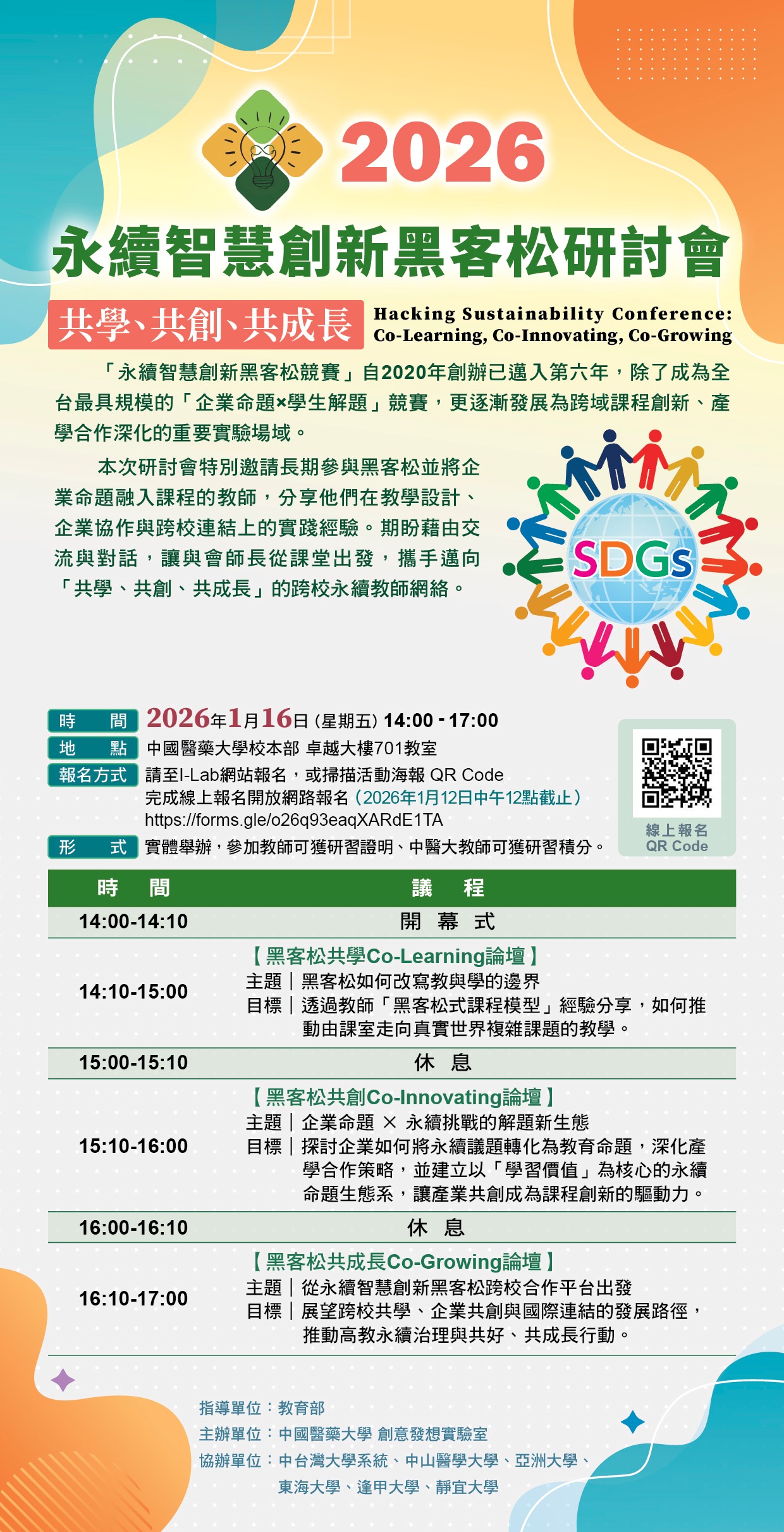 本校舉辦「2026永續智慧創新黑客松研討會:共學、共創、共成長」教師研習活動,開放網路報名(115年1月12日中午12點截止)。