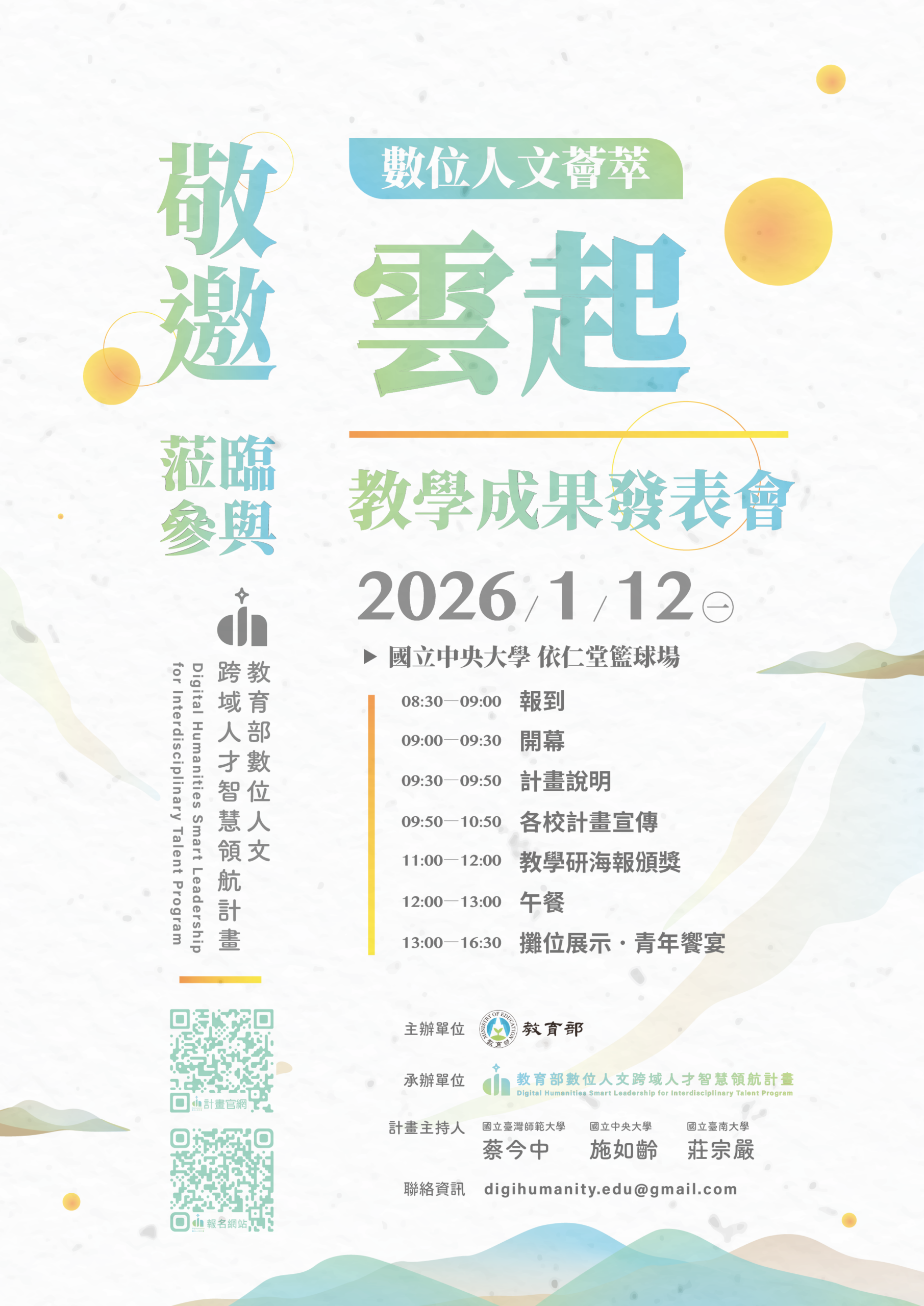 本部「數位人文跨域人才智慧領航計畫」訂於115年1月12日辦理教學成果分享會,請踴躍派員參加,詳如說明,請查照。