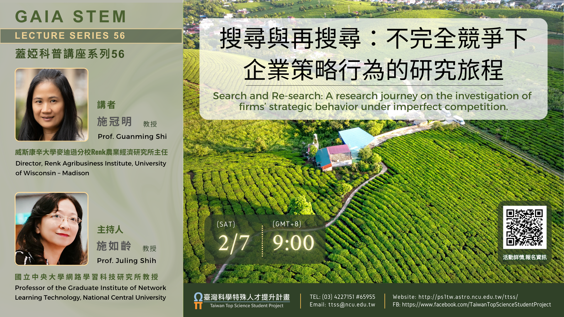 本校訂於115年2月7日辦理線上講座:《蓋婭科普講座系列 56》—— 「搜尋與再搜尋:不完全競爭下企業策略行為的研究旅程」,請惠予公告,並轉知貴校所屬師生踴躍報名參加,請查照。
