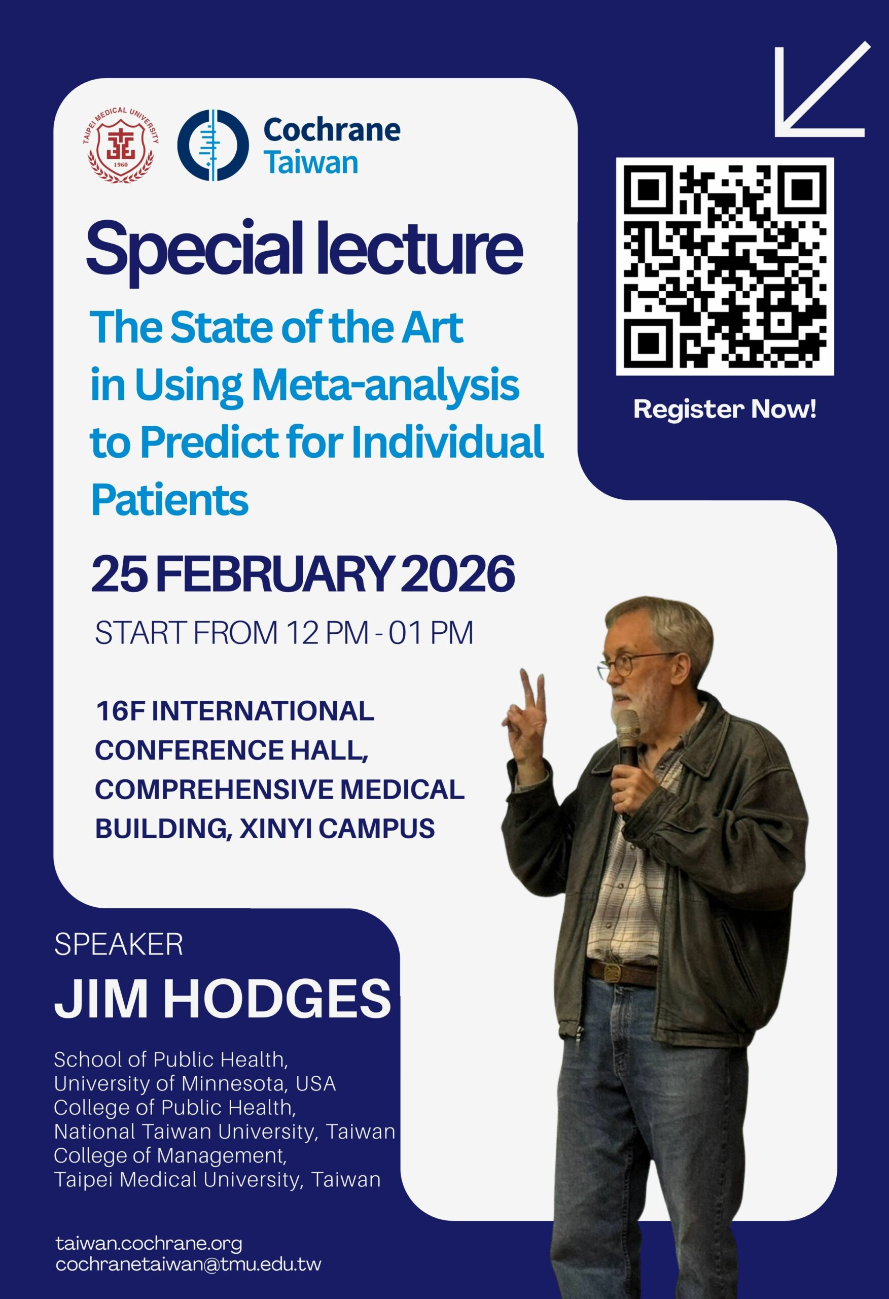 一、本校考科藍臺灣研究中心將於2026年2月25日(三)12:00-13:00假臺北醫學大學醫學綜合大樓後棟16樓胡水旺國際會議廳辦理專題演講「The State of the Art in Using Meta-analysis to Predict for Individual Patients」,報名相關資訊如附件。