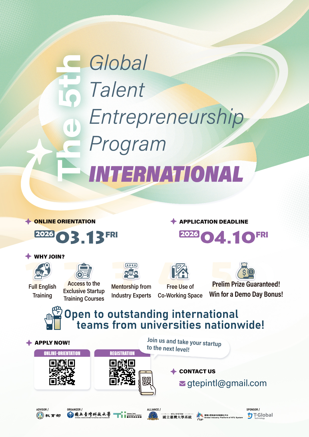 一、為提供在台外籍生培養創新創業知能及優質的創業培訓環境,本校今年接續推出旨揭計畫— T h e 5th G l o b a l T a l e n t Entrepreneurship Program (GTEP),本計畫開放全國大專校院外籍生及本國學生參加,通過初選即得企業贊助之創業獎金,更有機會贏得Demo Day優勝獎金!歡迎對創業有興趣、已創業或準備創業的學生敬請把握機會。