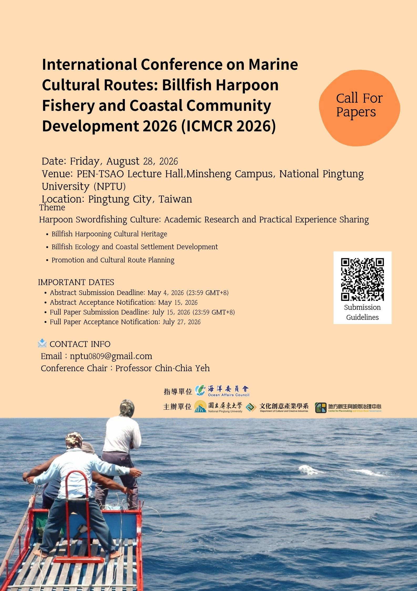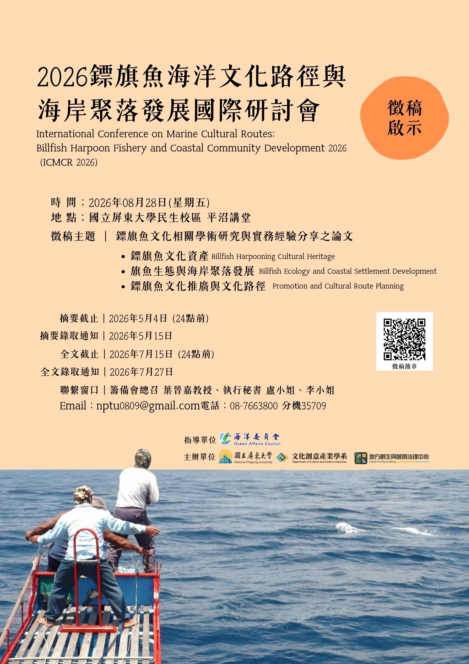 國立屏東大學「2026鏢旗魚海洋文化路徑與海岸聚落發展國際研討會」徵稿資訊1份