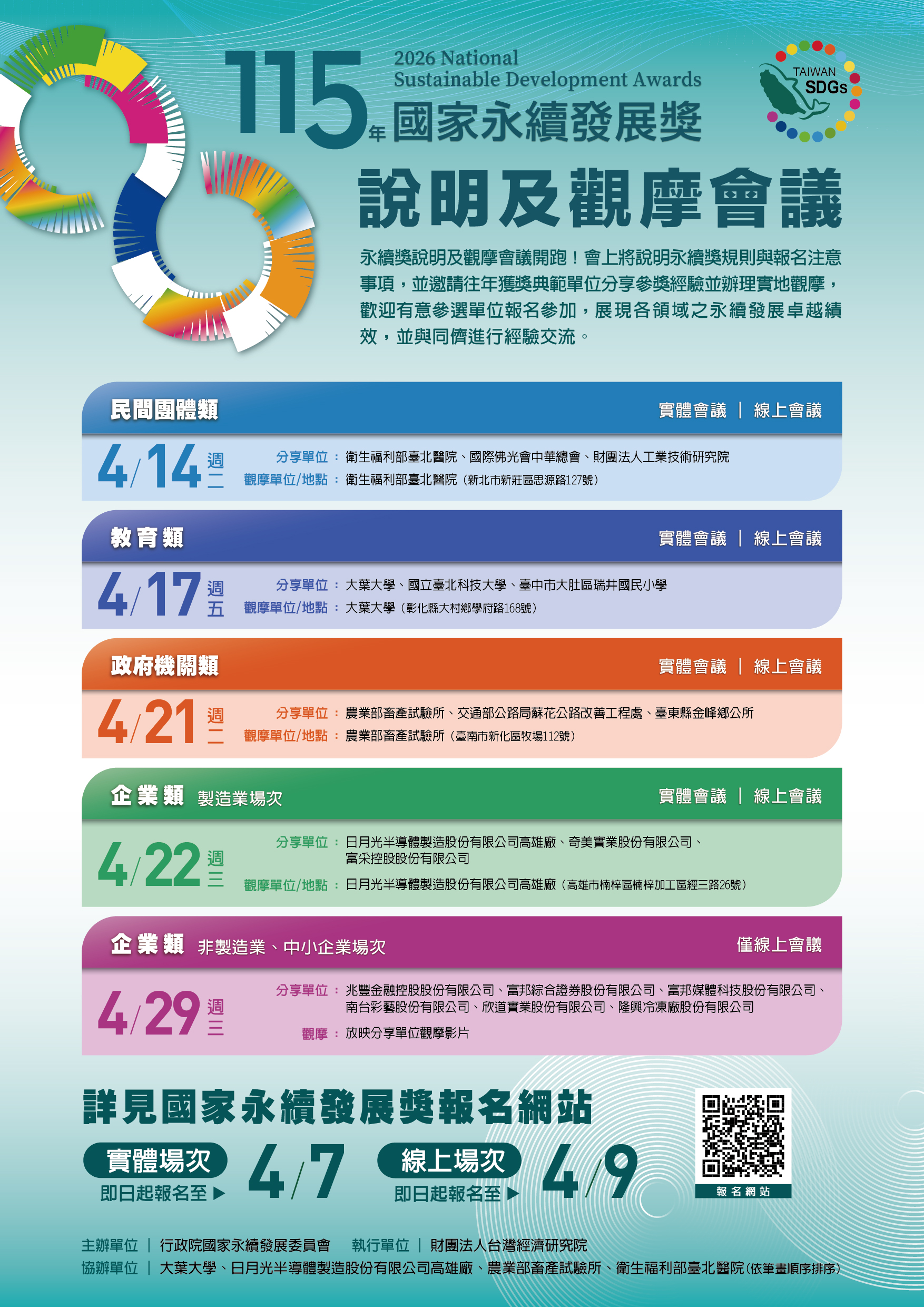 三、為增進各界對於國家永續發展獎之瞭解,並促進永續發展相關經驗互相交流與分享,永續會另舉辦「115年國家永續發展獎說明及觀摩會議」共計5場次,均可免費線上報名,歡迎有意參加本年度國家永續發展獎選拔者踴躍參加,活動資訊請參考附件3、4。(活動資訊網址:https://gov.tw/XST)