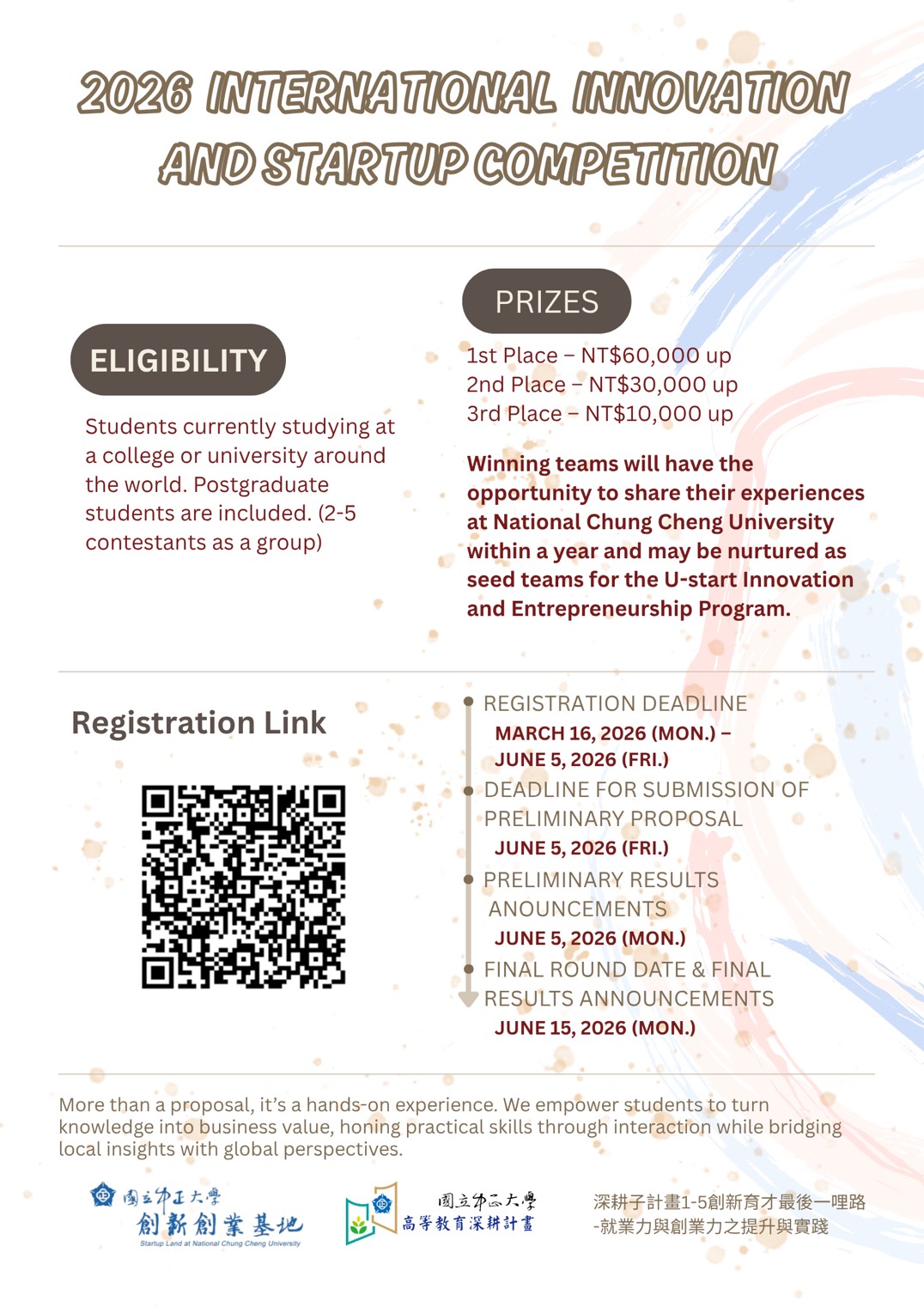 國立中正大學創新創業基地辦理「2026國際創新創業競賽」,敬請惠予公告並鼓勵學生(含研究生)踴躍報名參與。