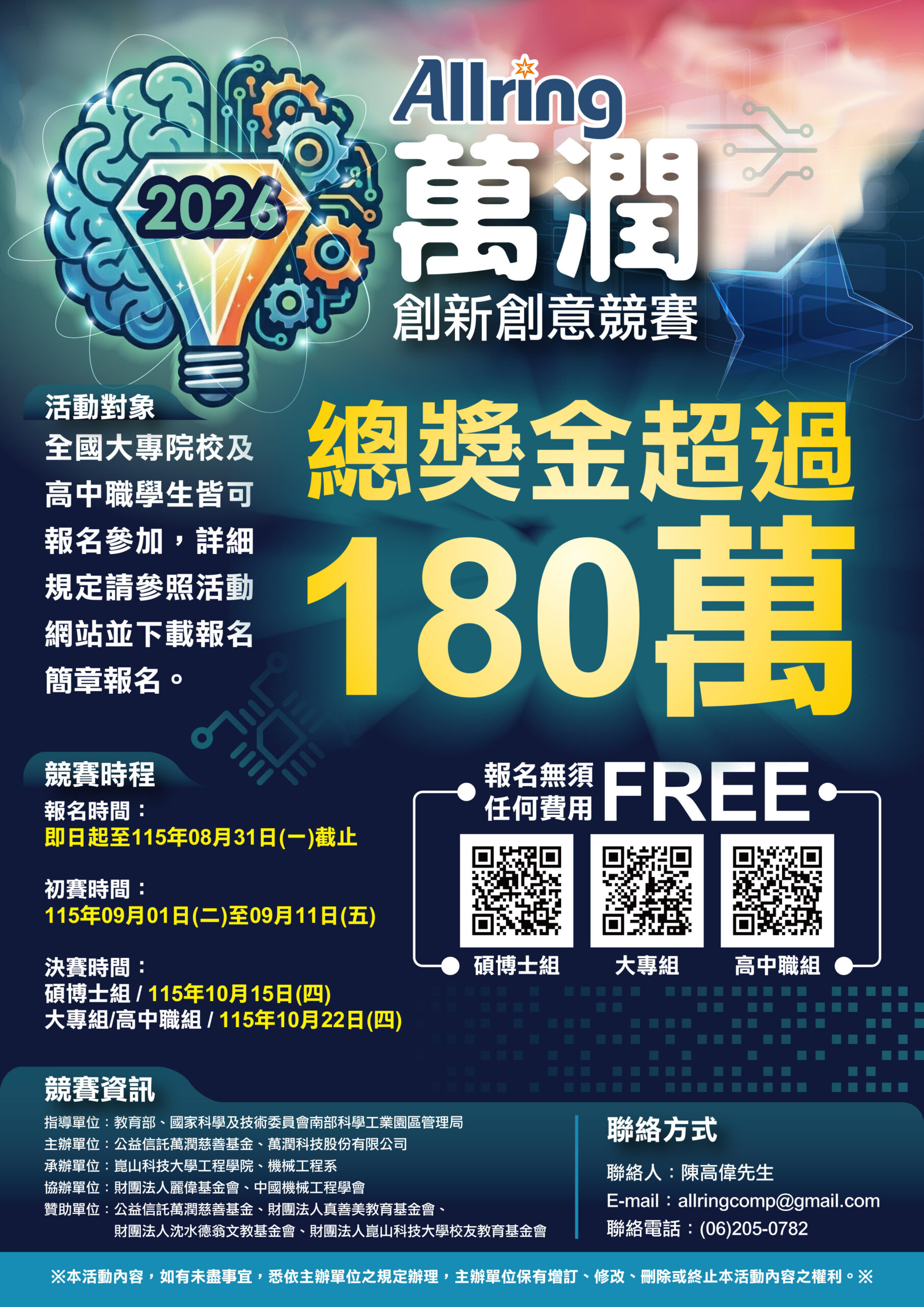 崑山科技大學辦理「萬潤 2026 創新創意競賽-(大專組)」,請貴校協助宣傳並鼓勵所屬師生踴躍參賽,請查照。