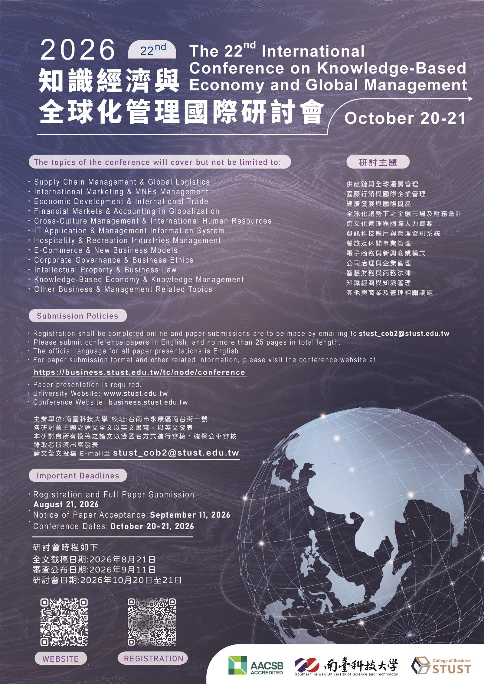 南臺學校財團法人南臺科技大學主辦「2026第二十二屆知識經濟與全球化管理國際研討會」訂於115年10月20日至21日舉行