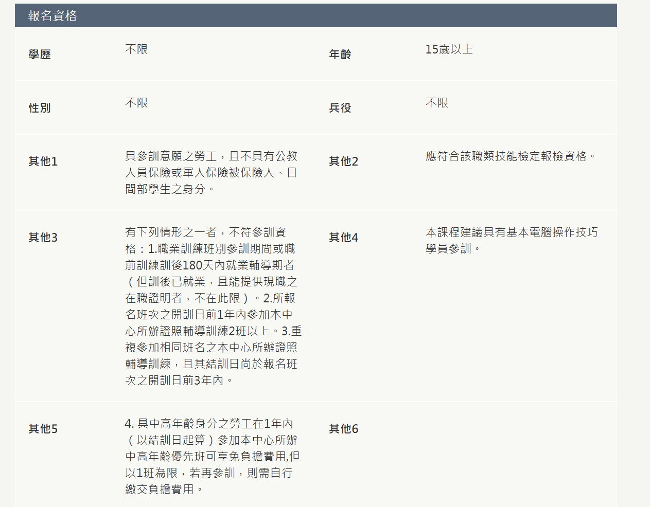 二、參與本班學員必需報名即測即評及發證技術士技能檢定,若未參加技能檢定考試者,下一次再報名其他課程列為備取。