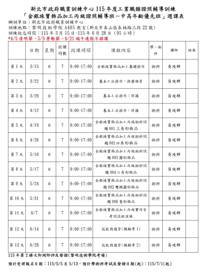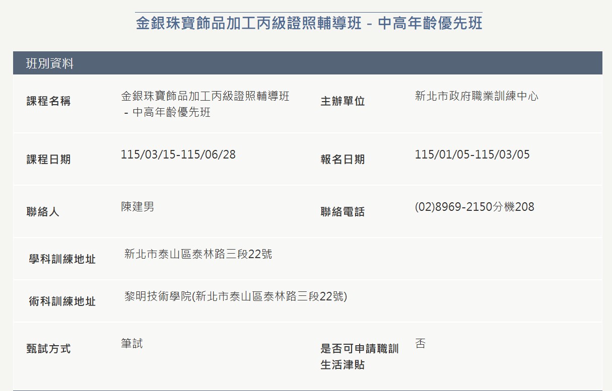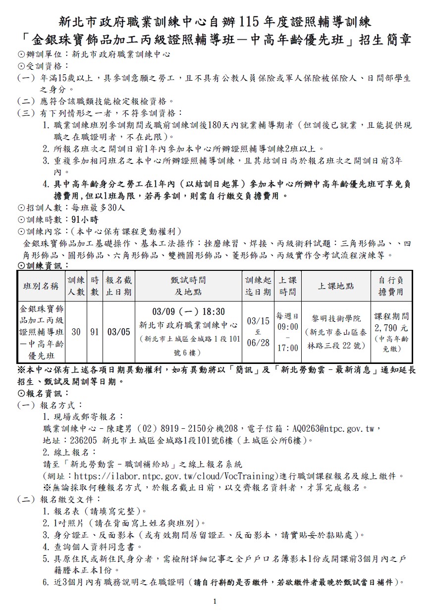本校辦理115年度新北職訓金銀珠寶飾品加工丙級證照輔導課程-中高年齡優先班