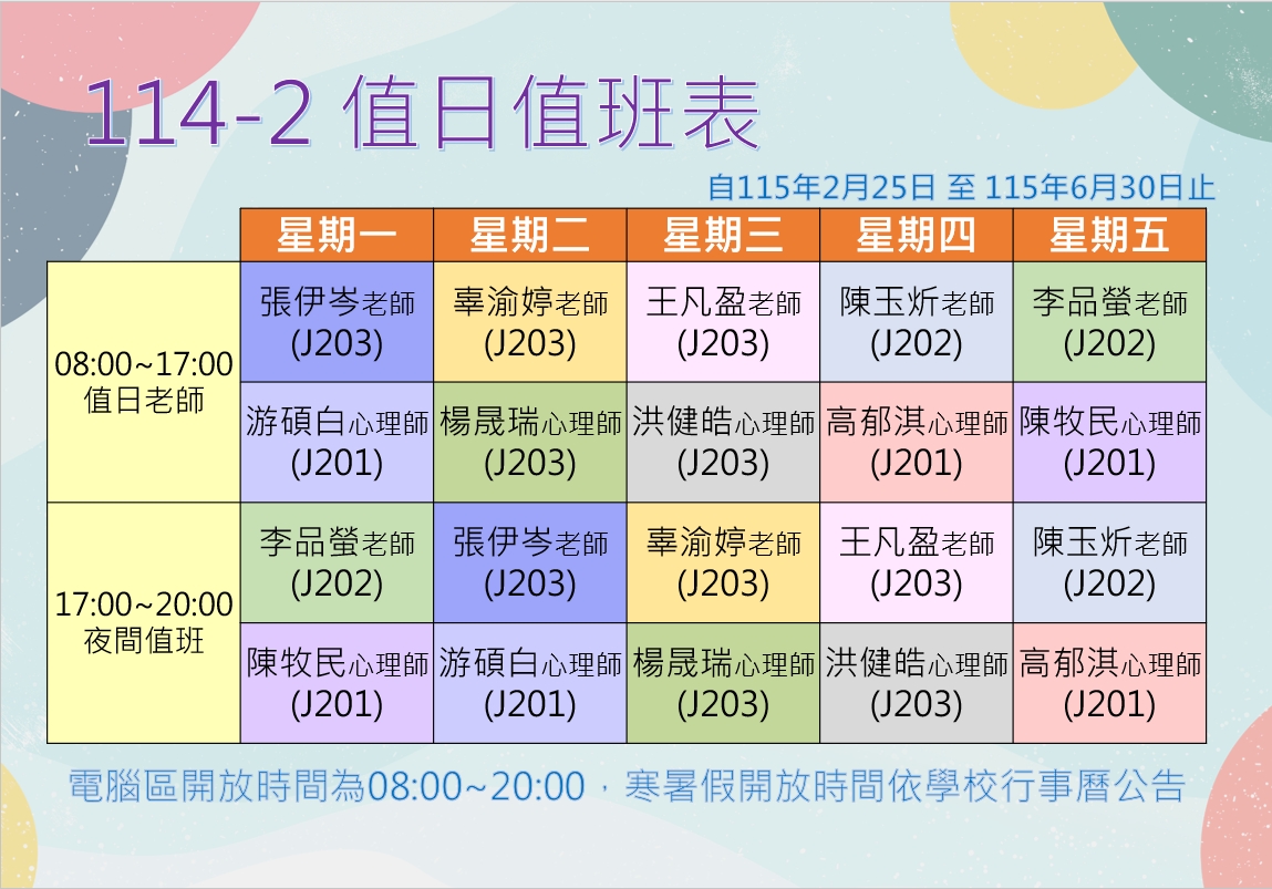 114-2學輔中心兼任心理師值班時間