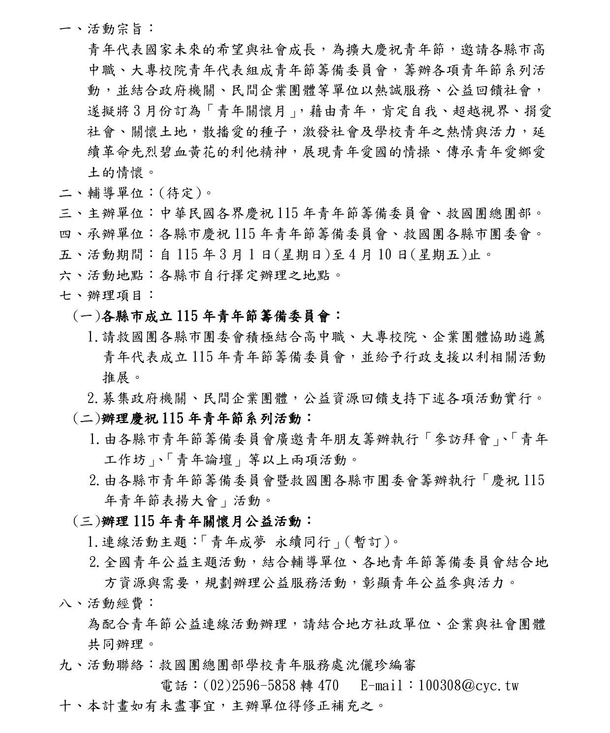 中華民國各界慶祝 115 年青年節活動實施計畫(草案)