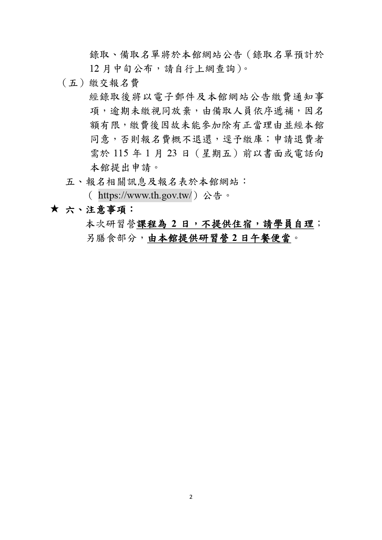 經錄取後將以電子郵件及本館網站公告繳費通知事項,逾期未繳視同放棄,由備取人員依序遞補,因名額有限,繳費後因故未能參加除有正當理由並經本館同意,否則報名費概不退還,逕予繳庫;申請退費者需於115年1月23日(星期五)前以書面或電話向本館提出申請。
