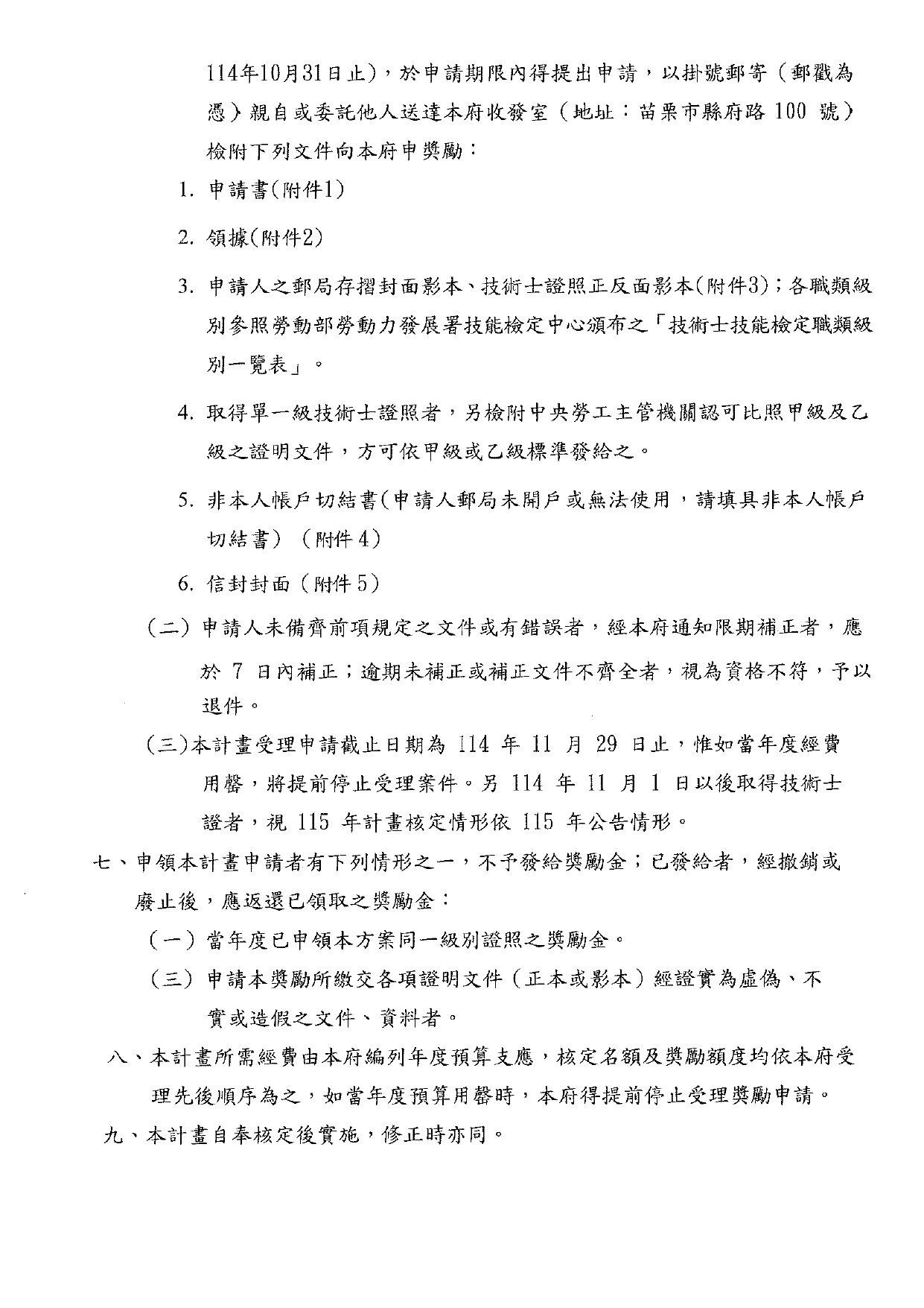 三、 旨揭計畫申請相關表件可至本府社會處網頁-便民服務-表單下載-苗栗縣政府114年獎勵低(中低)收入戶取得技術士證照試辦計畫及申請書,自行下載使用。