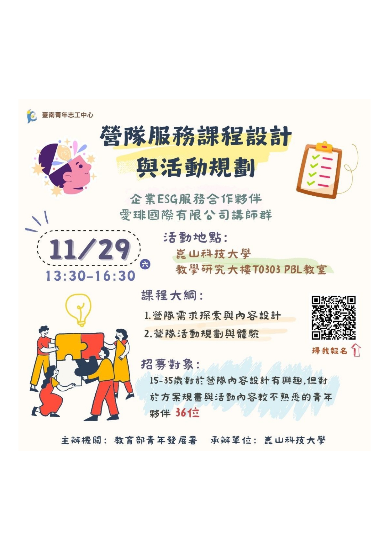轉知【臺南青年志工中心—營隊服務課程設計與活動規劃】