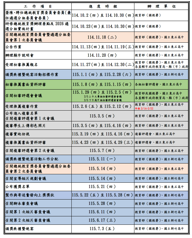 六、 推薦時間:自114年11月27日(星期四)起至114年12月30日(星期二)止(郵戳為憑),未於規定期限內函送相關表件及資料者,不予審查,視同資料不符,各單位及受推薦人不得異議,並請依「2026總統教育獎遴選分組實施計畫」規定,將相關推薦表件資料函送承辦學校國立東石高級中學辦理(地址:61357嘉義縣朴子市大鄉里253號)。