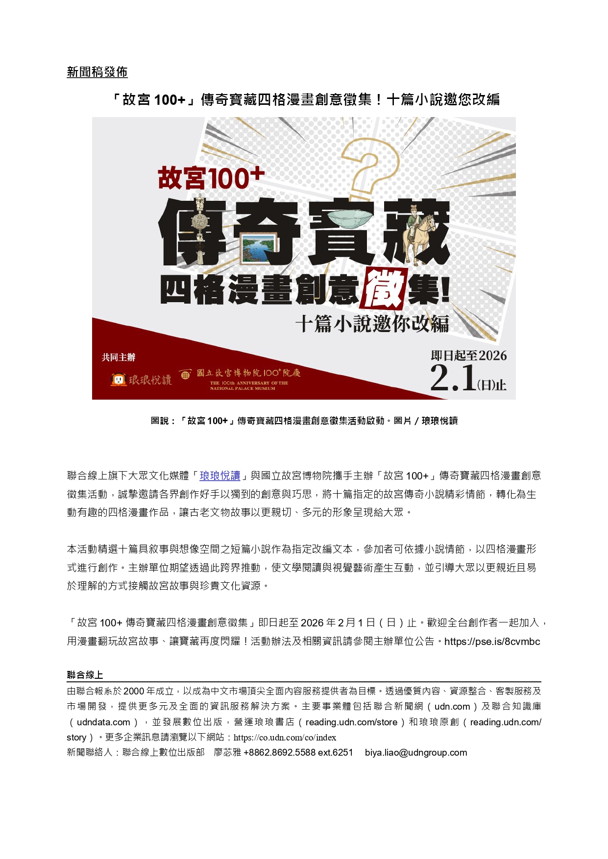 一、 聯合線上(udn.com)為鼓勵多元文化展現並推動跨界創作,本公司旗下「琅琅悅讀」特與國立故宮博物院共同舉辦「故宮100+ 傳奇寶藏四格漫畫創意徵集」活動。
