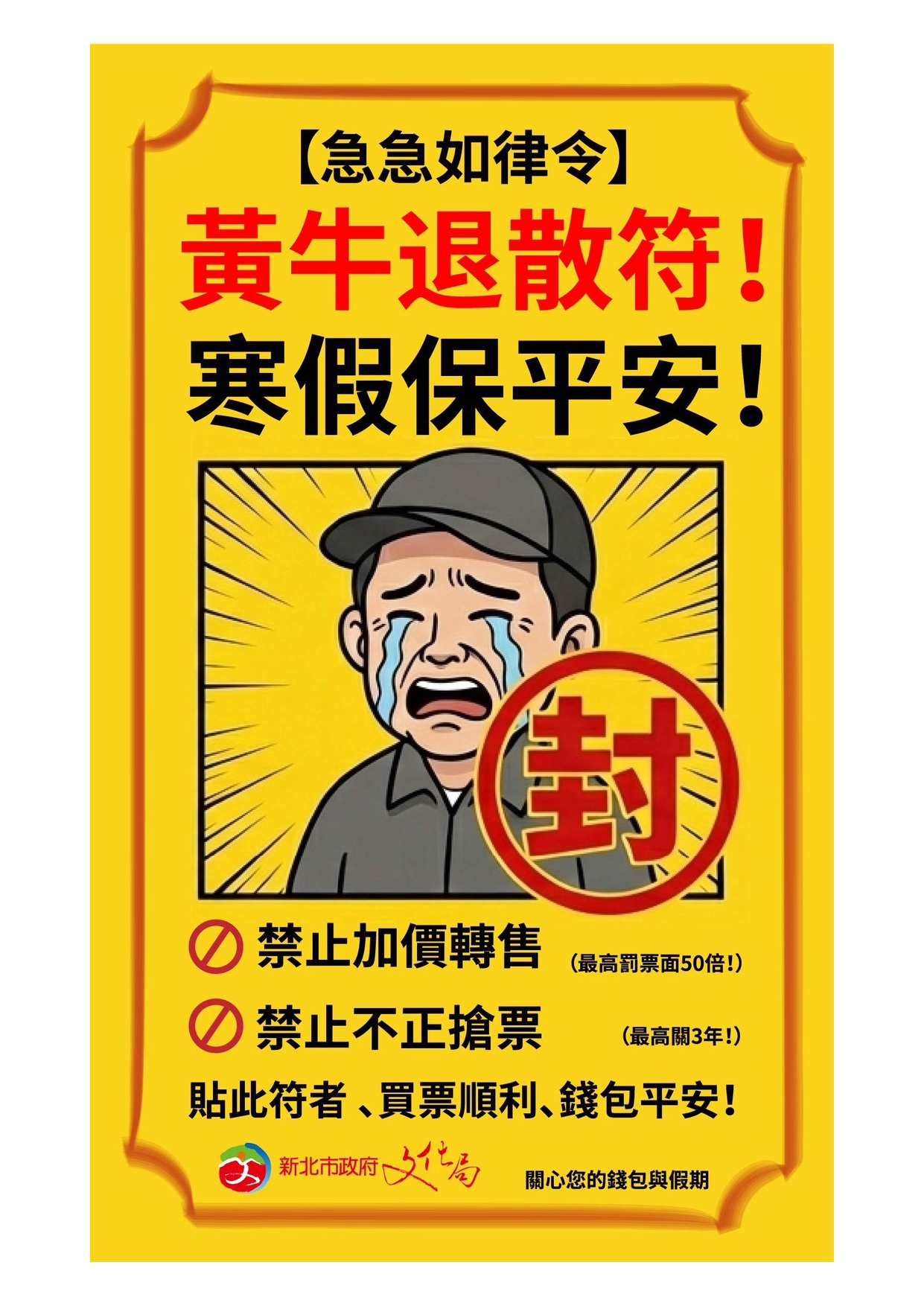 一、 「文化創意產業發展法」第10條之1於112年5月12日三讀通過,針對藝文表演票券以超過票面金額或定價販售者(簡稱販售黃牛票),處票面金額10倍至50倍罰鍰;針對不正方式搶票者,處三年以下有期徒刑,合先敘明。 二、 時值寒假期間,為確保藝文表演票券正常流通,保障民眾近用文化創意活動之權益,請協助相關黃牛票防治宣導,欣賞藝文表演須循正當售票管道,切勿販售或購買黃牛票,避免民眾及學生觸法。
