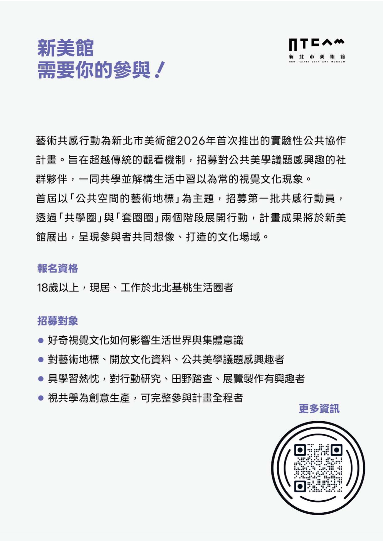 藝術共感行動為新北市美術館2026年首次推出的實驗性公共協作計畫。旨在超越傳統的觀看機制,招募對公共美學議題感興趣的社群夥伴,一同共學並解構生活中習以為常的視覺文化現象,透過與館方共同研究,將美術館機構轉化為公共資源以及開放的場域。